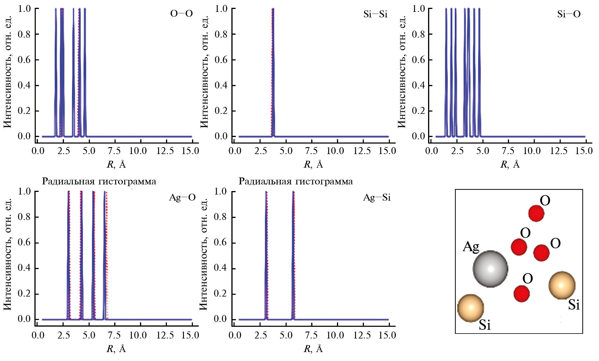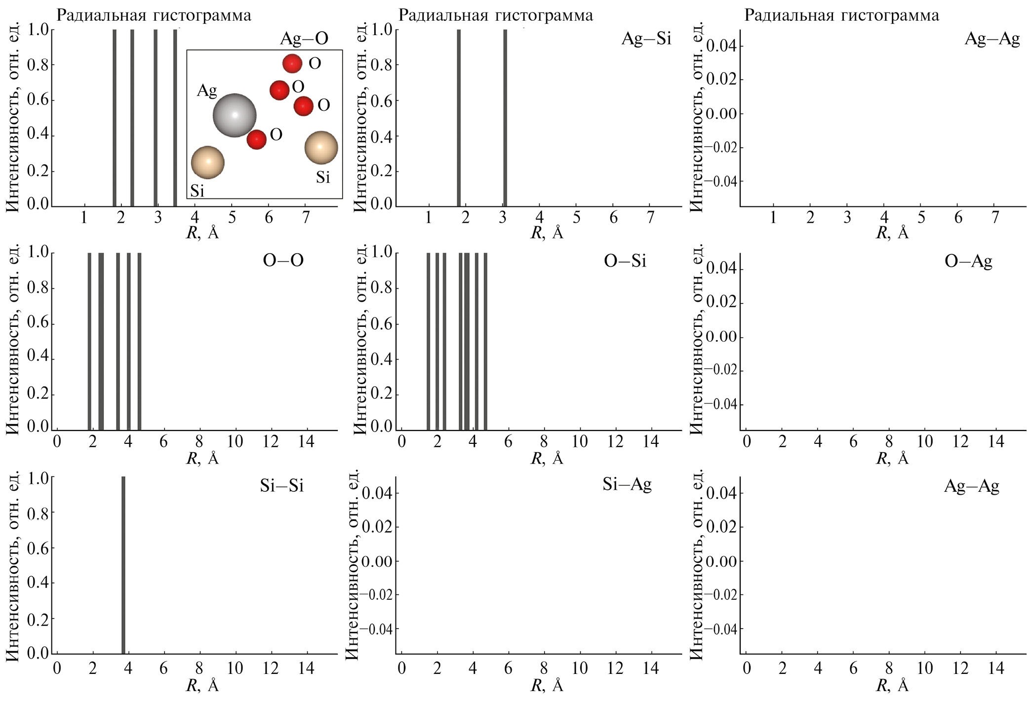 В случае центра окраски в силикатном стекле имеются атомы трех типов – Ag, Si и O, – и один из атомов Ag является поглощающим. В качестве примера рассмотрим центр окраски компонентного состава AgSi2O4, структура которого приведена на вставке на рис. 2, а соответствующие координаты – в табл. 1. Панели на рис. 2 показывают построенные гистограммы ПРФРА. Видно, что гистограммы парных расстояний с атомами серебра пусты, ввиду того, что поглощающий атом – Ag, удален из структуры центра окраски в процессе построения гистограмм. Очевидно, что в случае присутствия в структуре поглощающего атома Ag содержащаяся в них информация дублировала бы информацию из функций радиального распределения. Тем не менее наличие этих гистограмм, заполненных нулевыми значениями интенсивности, необходимо для обеспечения возможности рассмотрения систем, имеющих более одного атома того же типа, что и поглощающий (решение задачи без потери общности).