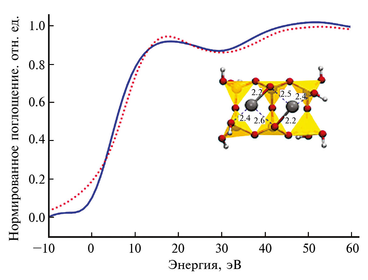 Рис. 8. Сопоставление спектров поглощения рентгеновского излучения вблизи K-края Ag, полученных с применением модели градиентного бустинга (сплошная линия), и спектра, рассчитанного в программе FMNESS (пунктирная линия), центра окраски в натриево-силикатной стеклянной матрице со структурой, полученной в работе [22] (показана на вставке).