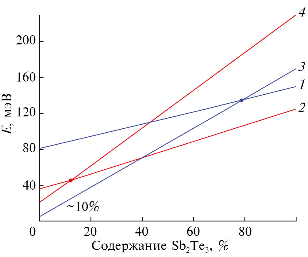 Рис. 1. Зависимости энергий плазмона Ер (1, 2) и перехода электронов между неэквивалентными экстремумами валентной зоны ∆Е (3, 4), в кристаллах Bi2Te3–Sb2Te3 при температурах 80 (1, 3) и 300 К (2, 4) [9].