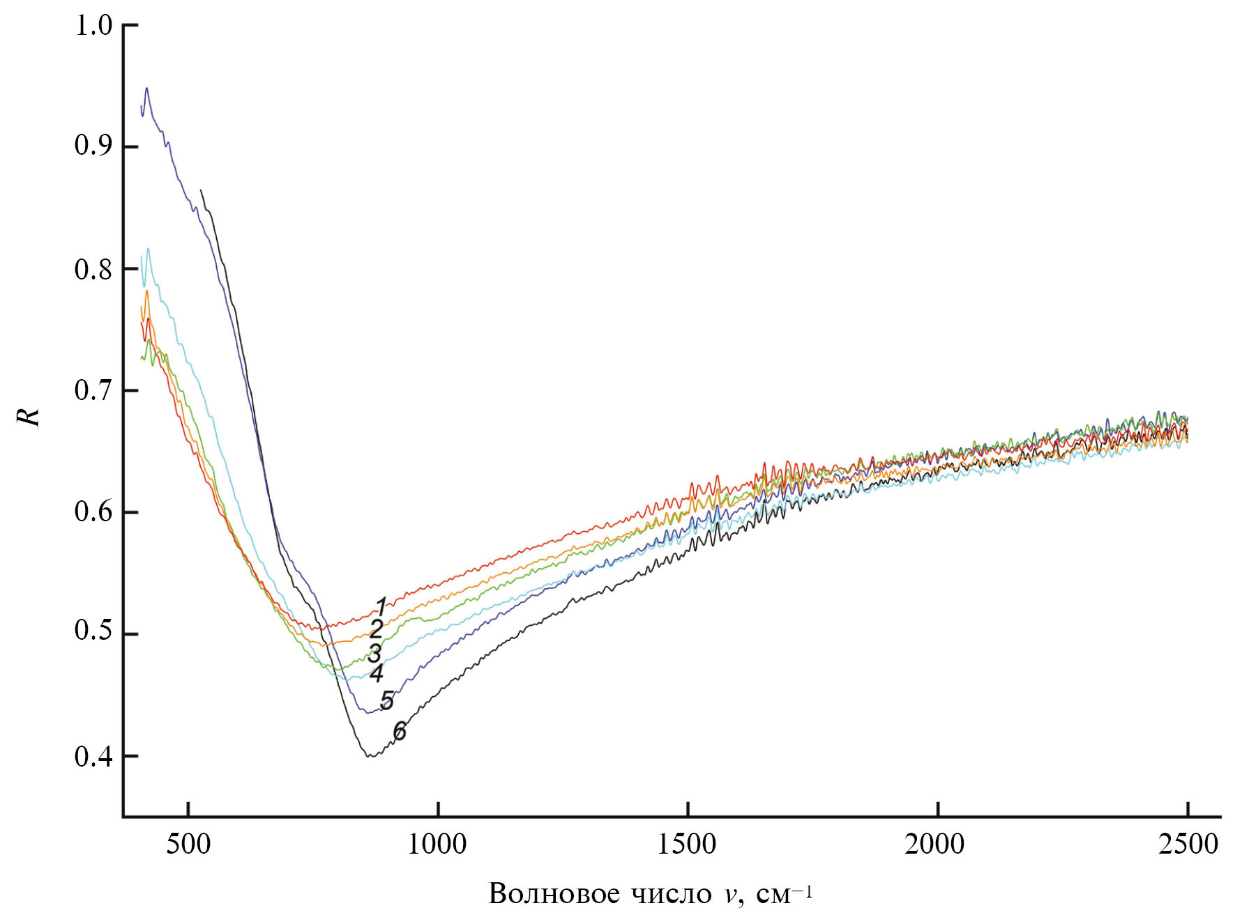 Рис. 2. Спектры коэффициента отражения R кристалла Bi0.6Sb1.4Te3, полученные при температурах 292 (1); 250 (2); 220 (3); 173 (4); 101 (5); 78 К (6).