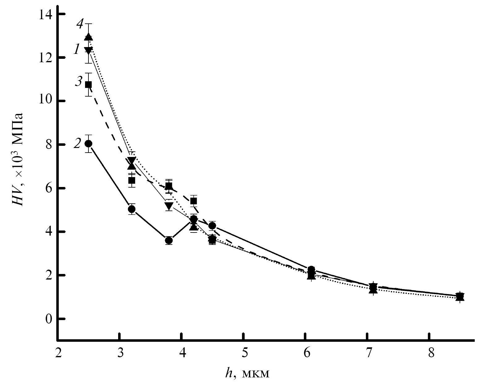 На рис. 4 представлена зависимость микротвердости от глубины проникновения индентора для необлученного и облученных с различной плотностью тока образцов. Видно, что микротвердость в зоне, модифицированной МИП с плотностью тока 50 и 100 А/см2, уменьшилась по сравнению с исходным образцом и облученным МИП с плотностью тока 150 А/см2. При глубине проникновения индентора ~4.5 мкм и более значения микротвердости совпадают между собой в пределах погрешности. Такая зависимость может быть связана с уменьшением плотности дислокаций при их отжиге, а также с ростом размеров области когерентного рассеяния при максимальной плотности ионного тока.