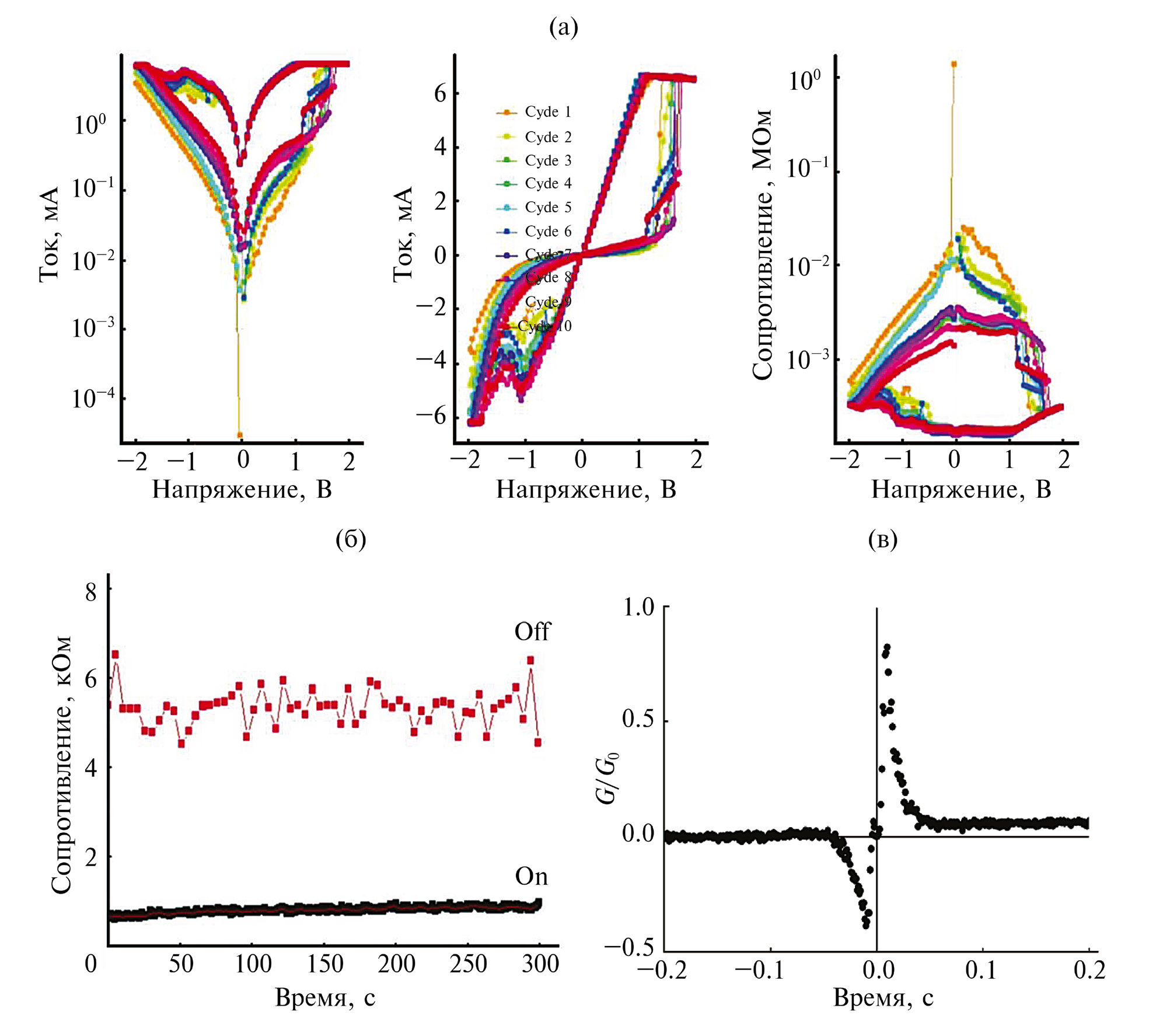 На рис. 1 и 2 продемонстрированы примеры вольт-амперных характеристик с резистивным переключением в микроконтактных и литографических структурах. Изученные гетерофазные образцы стабильно демонстрируют эффект резистивного переключения порядка 100 циклов с отношением высокорезистивного (обозначено “Off”) сопротивления к низкорезистивному (обозначено “On”) ROff /ROn ~ 5–1000 при условии ограничения тока. При увеличении тока выше определенного предела образцы деградировали.
