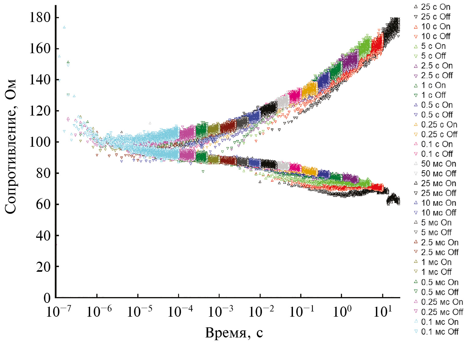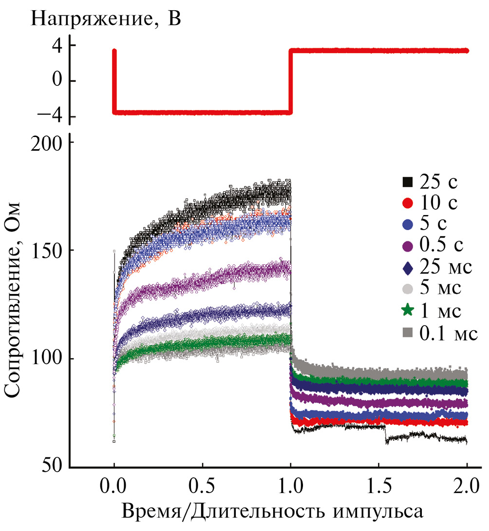 По протоколу 2 на образец Ag/NCO/NCCO/STO, полученный фотолитографией, подавали импульсы амплитудой 4 В длительностью от 25 с до 100 мкс, измеряли изменение сопротивление системы во время прохождения импульса (рис. 4).