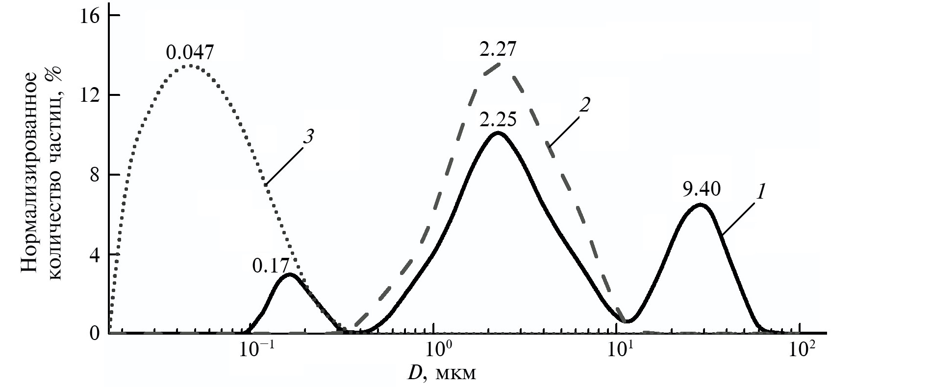 Рис. 1. Гранулометрический состав исходного микропорошка ZnO (1), и модифицированного 3 мас. % наночастиц nMgO (2) и нанопорошка nMgO (3)