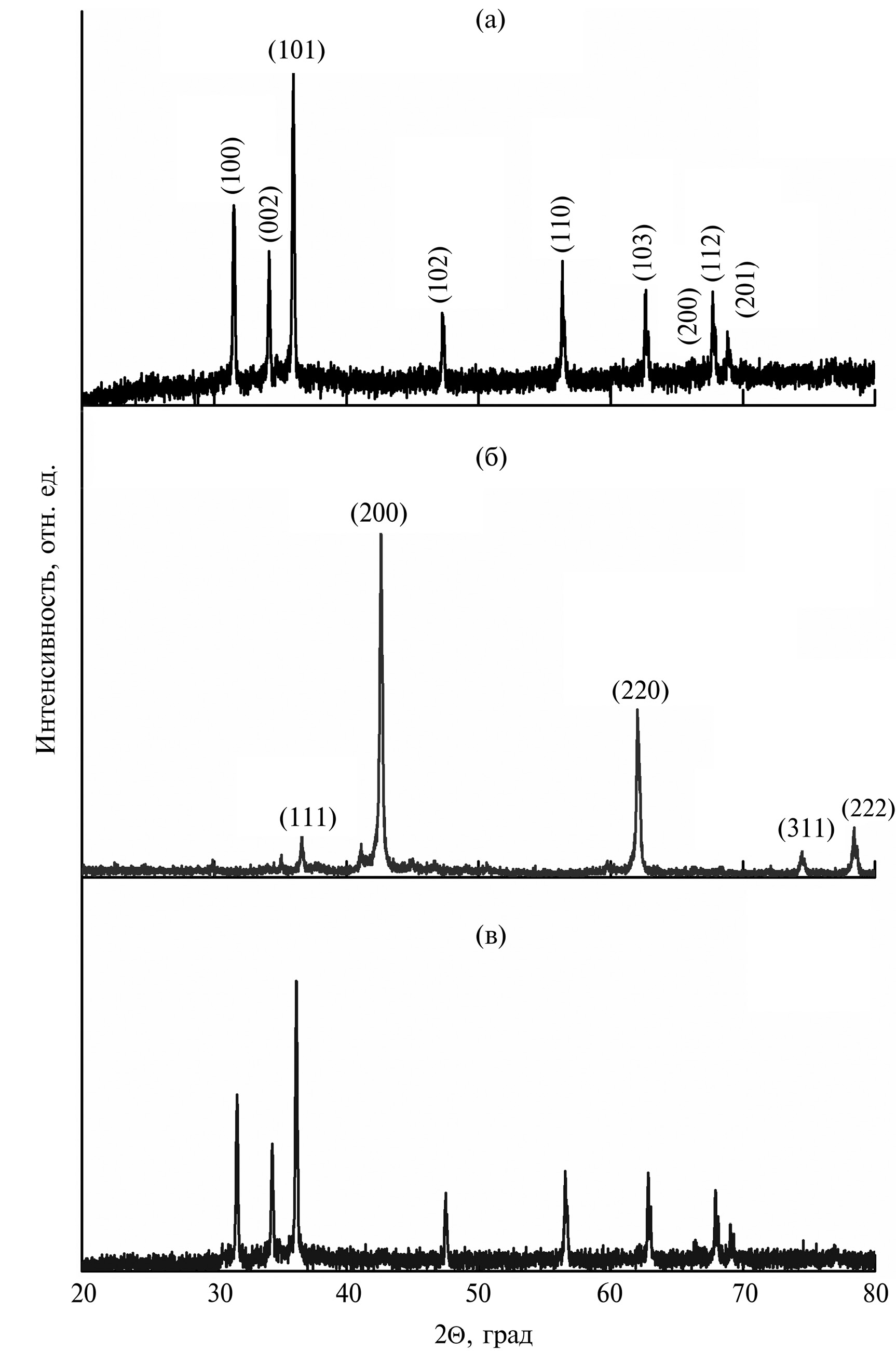 Рис. 2. Рентгенограммы исходного микропорошка ZnO (а), нанопорошка nMgO (б) и модифицированного порошка ZnO + 10% nMgO (в)