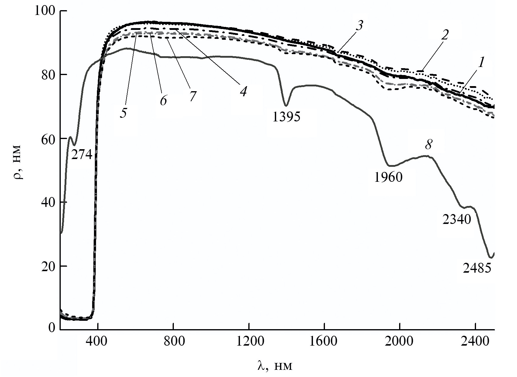 Рис. 3. Спектры диффузного отражения исходного (1), прогретого (2), модифицированного порошка ZnO с процентным содержанием наночастиц nMgO: 0.1 (3), 1 (4), 3 (5), 5 (6), 10 (7) мас. % и нанопорошка MgO (8)
