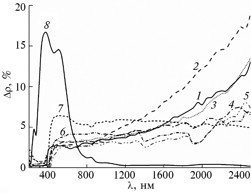 При облучении исходного и модифицированного порошков ZnO, а также нанопорошка MgO наблюдали уменьшение их отражательной способности во всей исследуемой области спектра излучения – от 200 до 2500 нм. Разностные спектры диффузного отражения (рис. 5) получены вычитанием спектров диффузного отражения облученного ускоренными электронами образца из спектров этих же образцов до облучения. Наибольшие изменения при флуенсе 2 × 1016 см–2 в исходном и модифицированных порошках наблюдали при длине волны 2500 нм и достигают значения 18%. В видимой области наибольшие значения Δρ, достигающие 7%, характерны для модифицированного порошка с максимальной концентрацией наночастиц MgO. Наименьшие значения Δρ практически во всей исследуемой области спектров зарегистрированы у порошка ZnO + 3% nMgO.