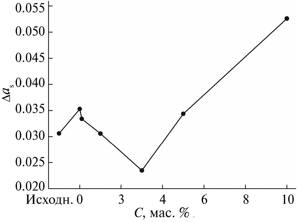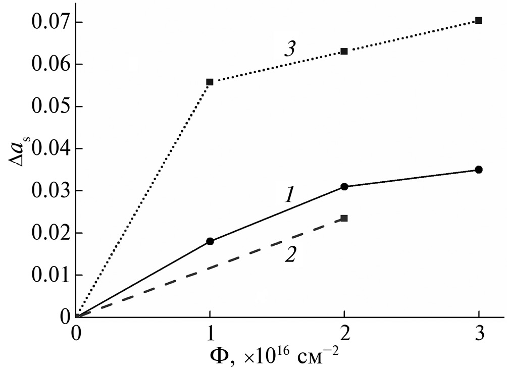Если сравнивать значения Δas для исходного микропорошка ZnO, нанопорошка MgO и модифицированного при оптимальной концентрации наночастиц микропорошка оксида цинка (рис. 7), то можно сделать вывод о том, что наименьшей радиационной стойкостью обладают наночастицы оксида магния. Их стойкость при флуенсе электронов 1 × 1016 см–2 в три раза хуже, чем у исходного оксида цинка. Но их добавление в качестве модифицирующей добавки позволяет существенно повысить радиационную стойкость этого микропорошка.