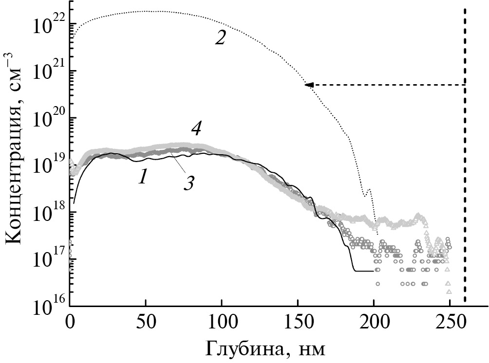 На рис. 2 показаны результаты расчета SRIM (кривая 1) и анализа методом ВИМС (кривая 3) распределения концентрации фосфора в первом образце. Режим имплантации фосфора (1.5 × 1015/60 + 4 × 1014/15) подбирали таким образом, чтобы остался кристаллический слой кремния толщиной около 110 нм, служащий затравочным при последующей рекристаллизации (расчетная номинальная концентрация вакан- сий – кривая 2). Для оценки толщины аморфизированного слоя использовали расчеты [26], где была принята относительная величина критической концентрации дефектов 10%. Из рис. 2 также следует, что экспериментальное распределение фосфора в структуре практически совпадает с результатами расчета по SRIM. Отжиг в режиме 2 (кривая 4) не приводит к существенному изменению профиля легирующей примеси.