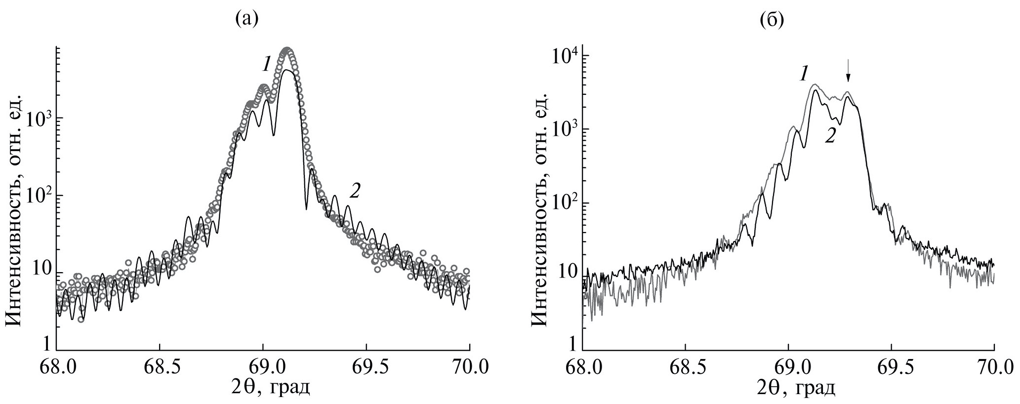 Рис. 6. Рентгенодифракционный анализ структуры КНИ: а – после имплантации бора с предаморфизацией ионами фтора (1 – эксперимент, 2 – подгонка); б – после отжига в режимах 1 (1) и 2 (2), пик деформированного слоя кремния (деформация сжатия) помечен стрелкой