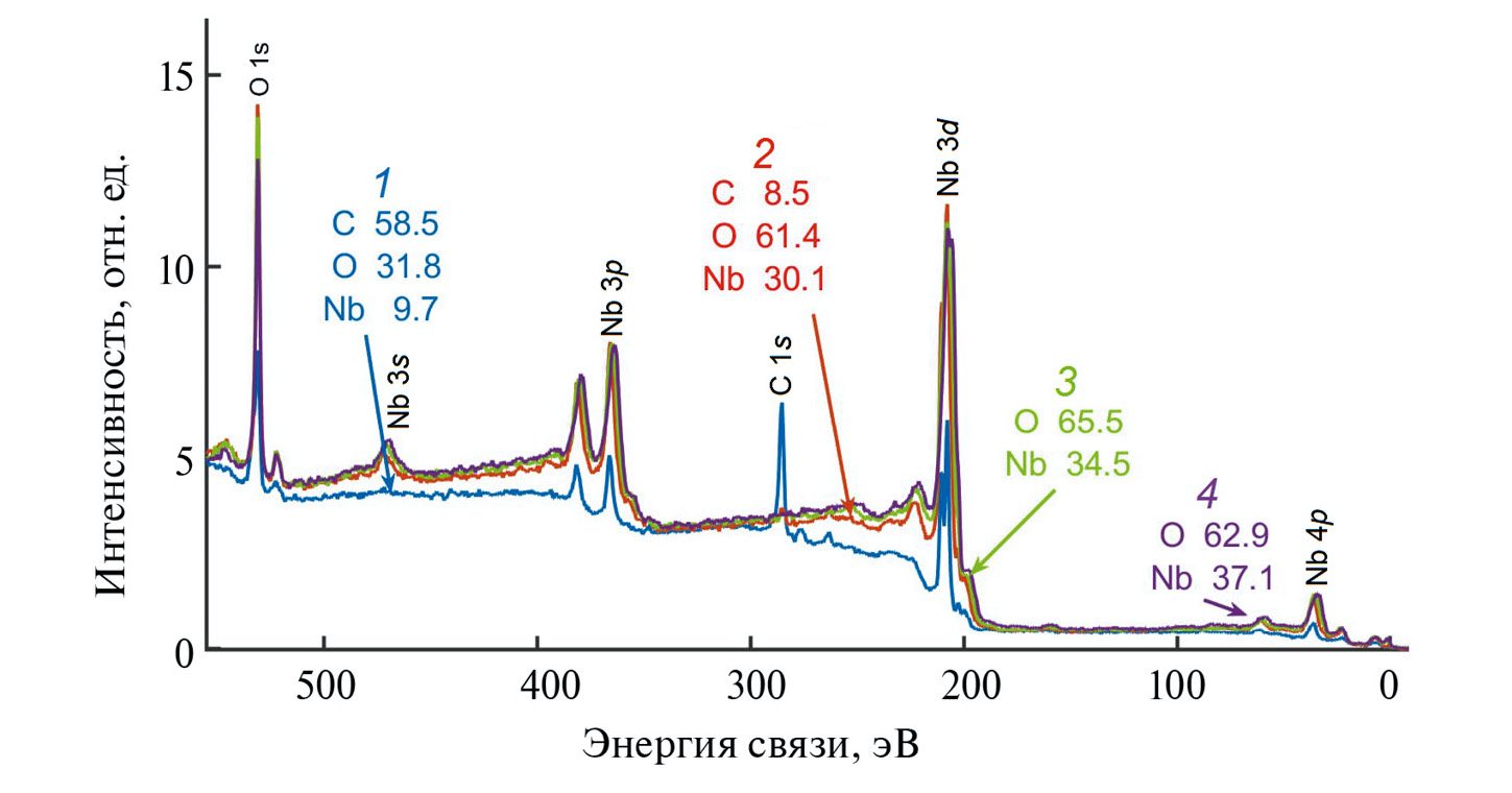 Фазовый состав поверхности определялся из обработки рентгеновских фотоэлектронных спектров линии Nb 3d. Для достоверности представленных результатов анализа выполнено разложение линии O 1s.