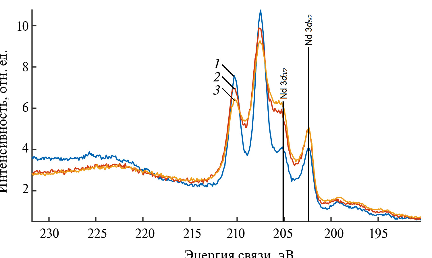 Рис. 5. Детальные спектры линии Nb 3d окисленной пленки ниобия толщиной 100 нм: 1 – до ионного воздействия; 2 – после первого этапа; 3 – после второго этапа