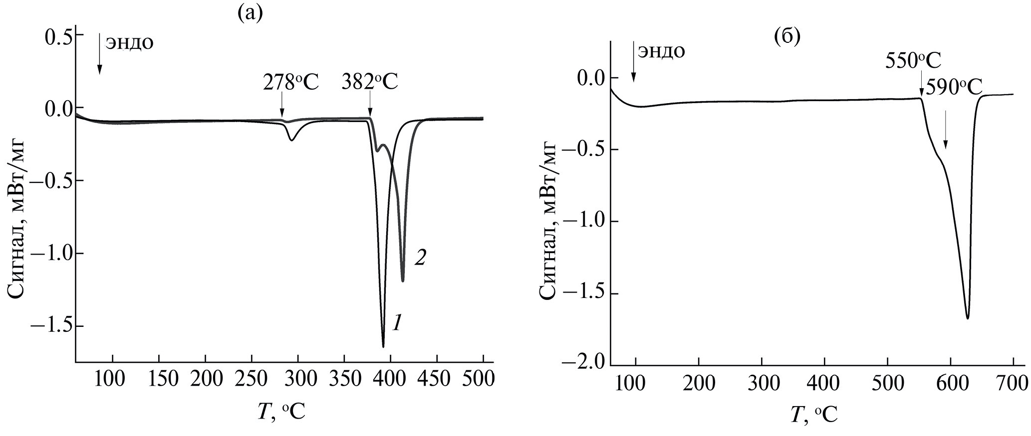 Рис. 2. Кривые ДСК исходных сплавов (а): припоя HTS-2000 (1) и сплава Zn97.5Al2.5 (2), а также АМг6 (б) при нагреве со скоростью v = 10°C/мин