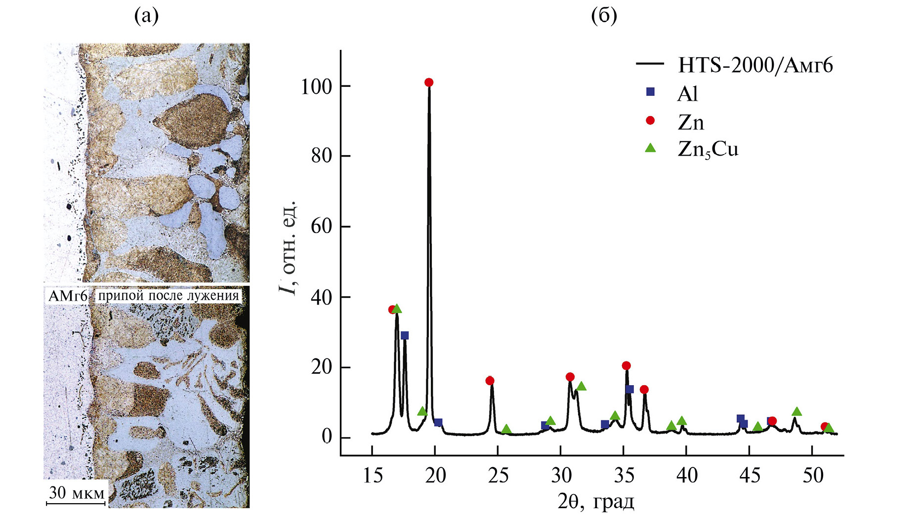 На рис. 3 приведены морфология (рис. 3а) и рентгенограмма (рис. 3б) полученных композитов из припоя и АМг6 после лужения. Уже на стадии лужения происходит активное взаимодействие Zn и Al, что приводит к образованию развитой морфологии в зоне соединения. Фазовый состав припоя после лужения качественно не меняется и состоит из твердых растворов на основе Al и Zn, а также интерметаллида Zn5Cu. Однако структура припоя, затвердевшего на поверхности АМг6, хотя и сохраняет следы эвтектической кристаллизации, становится намного грубее по сравнению с исходной мелкодифференцированной эвтектической структурой припоя. Вблизи поверхности подложки наблюдали вырожденную эвтектическую кристаллизацию, при которой столбчатые кристаллы фазы α растут от поверхности АМг6, и только после этого между ними образуются кристаллы фазы β и интерметаллида, а совместный эвтектический рост происходит только в верхней части луженого слоя. Такое изменение характера кристаллизации может быть вызвано не только влиянием диффузионных процессов и перераспределением компонентов между припоем и подложкой, но и изменением условий охлаждения. Исходный припой получают при закалке расплава, а образец после лужения затвердевает в условиях средних скоростей охлаждения.