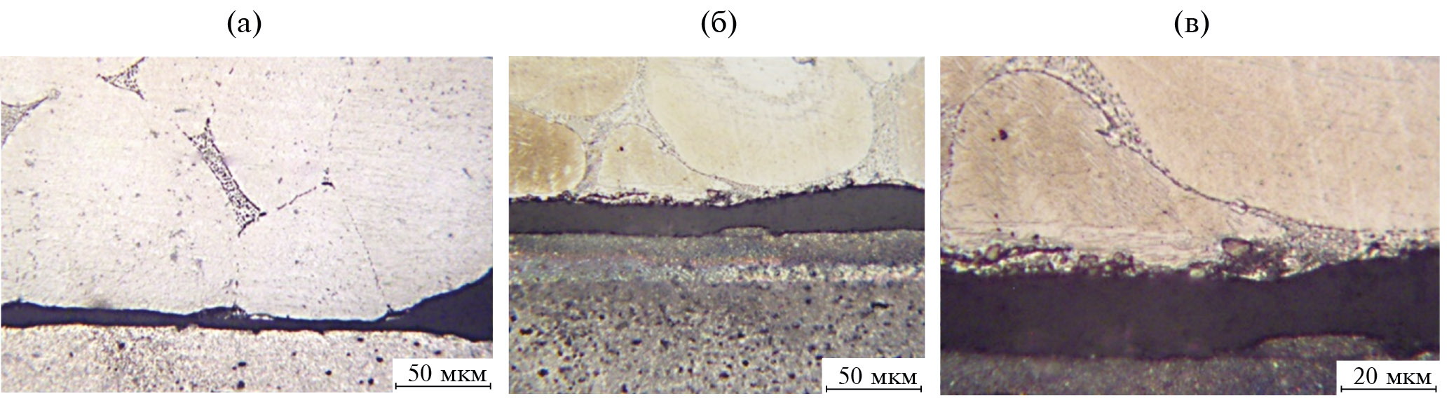 Исследование процессов контактного плавления сплава Zn97.5Al2.5 и АМг показывает, что температуры 400°С недостаточно для образования плотного композита в процессе лужения (рис. 8а). Выбранный сплав в основном состоит из крупных дендритов твердого раствора на основе Zn, которые плавятся при более высокой температуре. Однако даже в этом случае при последующей термообработке наблюдали интенсивные диффузионные процессы между припоем и подложкой (рис. 8б, 8в), в результате которых на границе контакта изменяется структура как подложки, так и сплава Zn97.5Al2.5. Сплав Aмг6 в приграничной области обедняется Mg и Mn (интерметаллидные включения растворяются), а в припое образуются более выраженные кристаллы фазы α и интерметаллиды Zn–Mg.