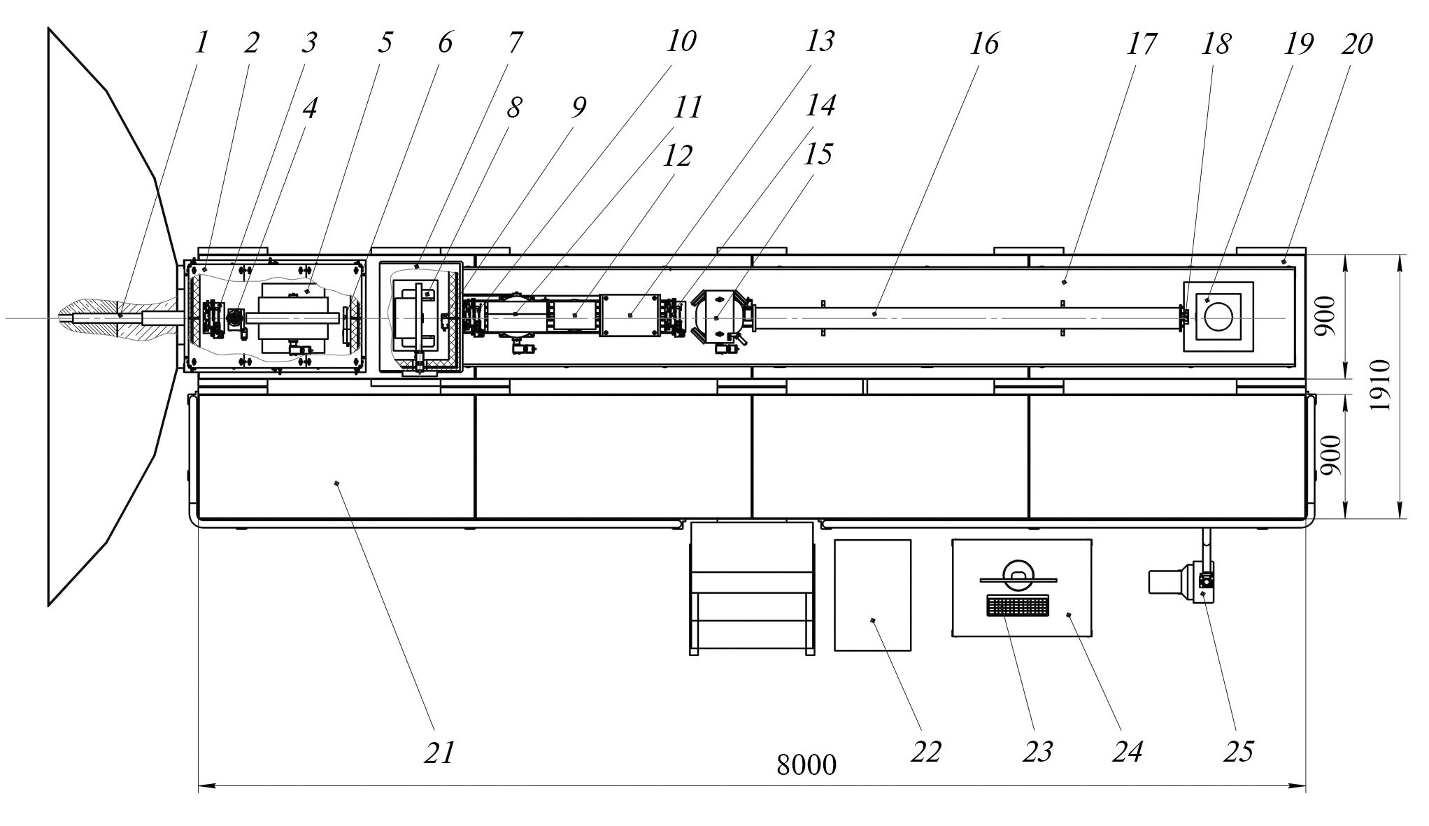 Рис. 1. Схема нейтронного рефлектометра ТНР: 1 — внутриканальный коллиматор в защите реактора “ПИК”; 2 — защита отклоняющего (фильтрующего) пучок зеркала; 3, 10, 14 — дистанционно управляемые диафрагмы; 4 — лазерный юстировочный модуль; 5 — отклоняющее (фильтрующее) пучок зеркало; 6 — монитор нейтронного пучка; 7 — защита прерывателя нейтронного пучка; 8 — прерыватель нейтронного пучка; 9 — заслонка пучка; 11 — нейтронно-оптический формирователь пучка; 12 — магнитная система для создания ведущего магнитного поля; 13 — радиочастотный модуль для изменения спина частиц; 15 — узел с образцом; 16 — вакуумный тракт; 17 — базисная немагнитная приборная платформа; 18 — дистанционно управляемая диафрагма; 19 — детектор в блоке защиты; 20 — виброустойчивый приборный стапель; 21 — стапель для персонала; 22 — шкаф с электроникой; 23 — управляющий компьютер; 24 — рабочий стол; 25 — вакуумный насос.