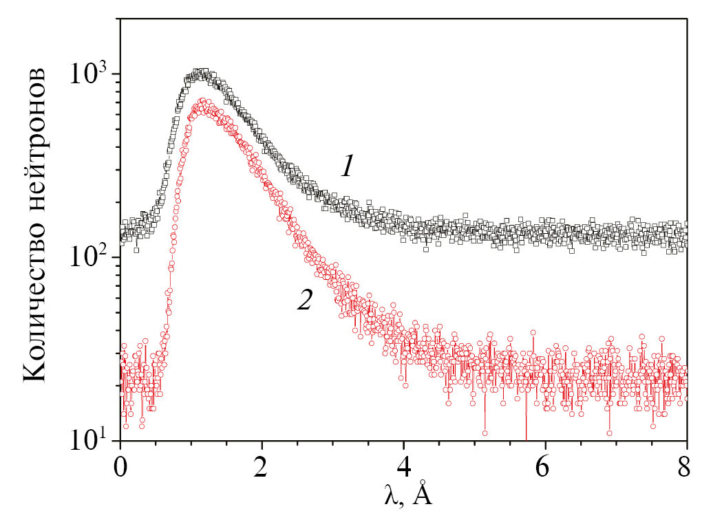 Рис. 2. Нейтронные спектры прямого пучка, вышедшего из внутриканального коллиматора (1) и отраженного от отклоняющего зеркала (2), при экспозиции 600 с.