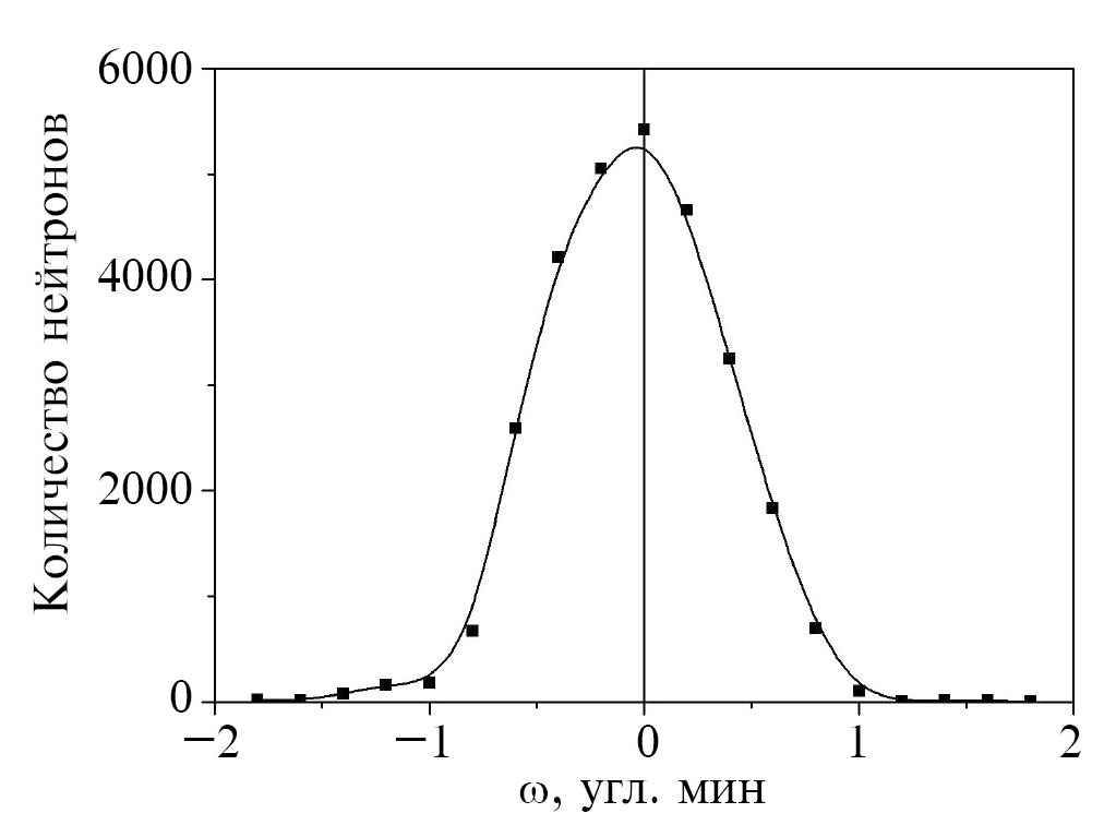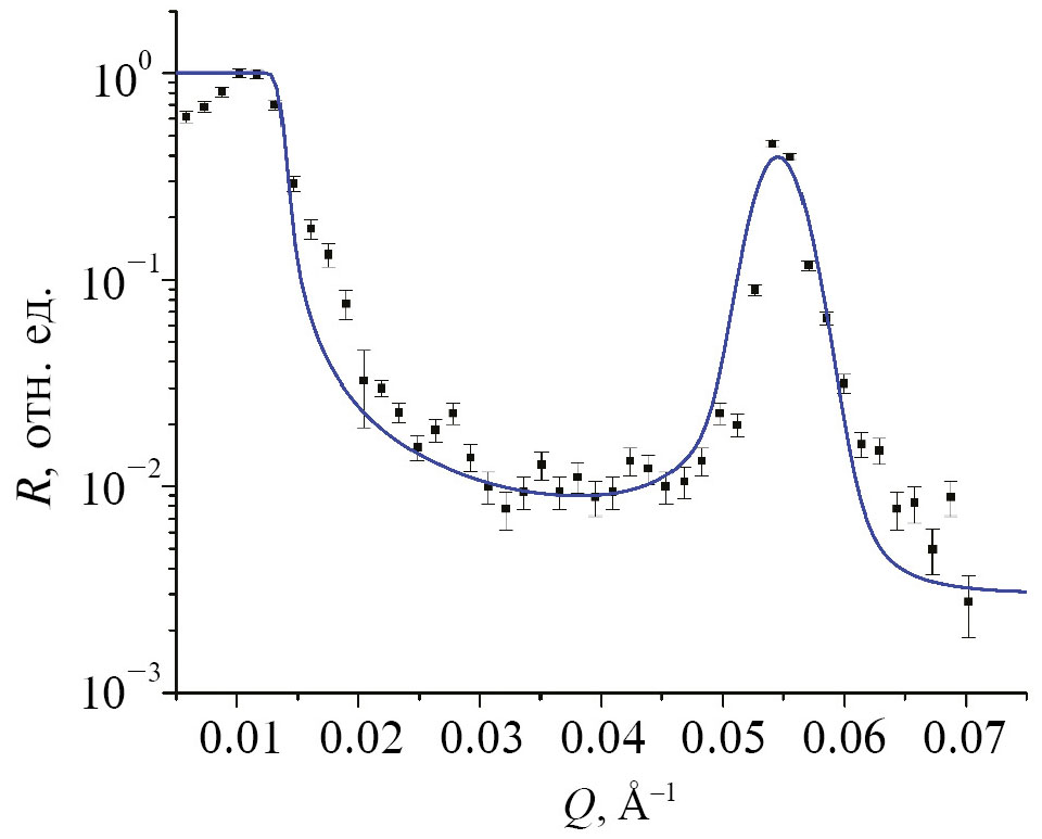 Для проведения нейтронных измерений с помощью системы диафрагм был сформирован пучок шириной 0.2 и высотой 30 мм, угловая расходимость падающего пучка в горизонтальной плоскости составила 0.01° (0.17 мрад). Для подавления фона незеркально рассеиваемых нейтронов перед детектором установили дополнительную диафрагму шириной 0.25 и высотой 70 мм. Юстировку образца осуществляли путем перемещения перпендикулярно пучку и вращением вокруг вертикальной оси. На рис. 8 представлены экспериментальная (символы) и расчетная (сплошная линия) зависимости коэффициента отражения нейтронов.