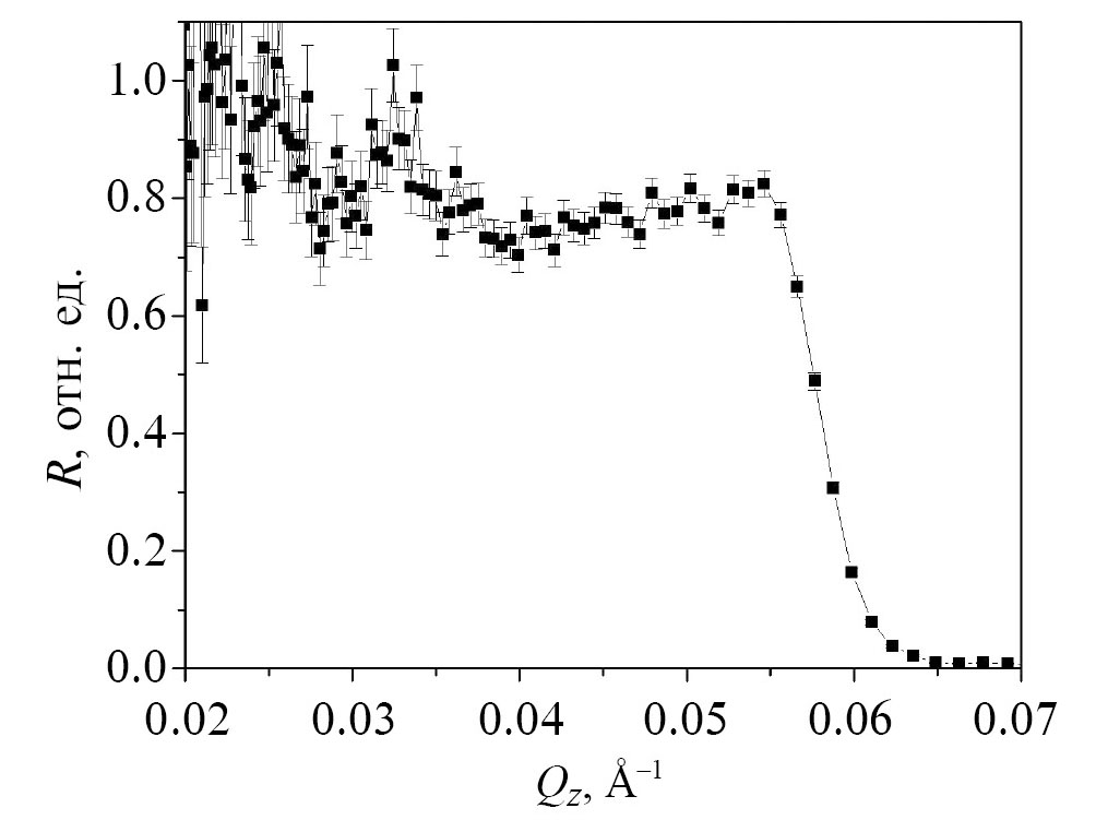 После юстировки были проведены измерения с нейтронно-оптическим образцом — суперзеркалом, представляющим собой апериодическую многослойную наносистему из 171 пары чередующихся слоев Ni и Ti (m = 2.5), каждая пара — толщиной 150 Å. Слои были нанесены на полированную стеклянную подложку размером 10 × 80 × 250 мм с помощью напылительной установки ПИЯФ, предназначенной для изготовления нейтронно-оптических элементов для нейтроноводной системы и новых нейтронных станций реактора “ПИК”. На рис. 5 представлена кривая зависимости коэффициента отражения R от нормальной компоненты переданного импульса Qz от образца суперзеркала. Как следует из рисунка, коэффициент отражения достигает R > 0.7 в области Qz < 0.056 Å–1, что соответствует параметру m = 2.56, близкому к расчетному значению, полученному при напылении покрытия образца m = 2.5. Таким образом, суперзеркало вполне пригодно для использования в качестве нейтронно-оптического элемента в нейтроноводе.