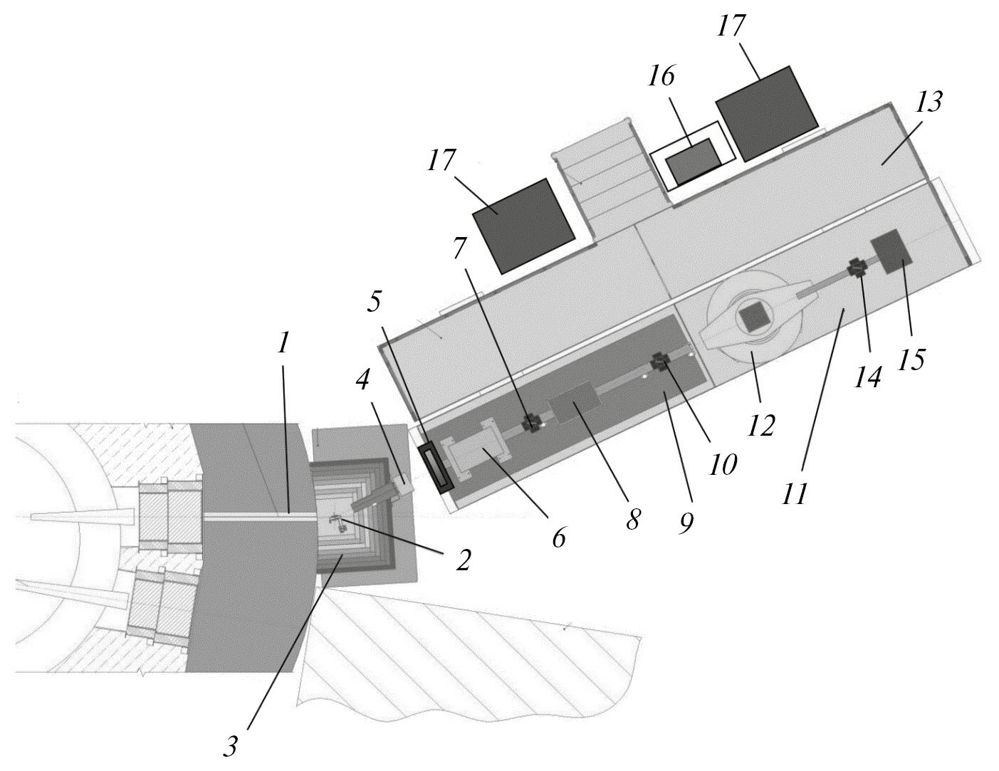 Рис. 6. Cхема рефлектометра поляризованных нейтронов NERO-2: 1 — коллиматор в защите реактора; 2 — фокусирующий монохроматор; 3 — защита монохроматора с фоновым коллиматором; 4 — заслонка пучка; 5 — коллимирующая диафрагма; 6 — нейтронно-оптический формирователь пучка; 7, 10 — дистанционно управляемые диафрагмы; 8 — радиочастотный модуль для изменения спина частиц; 9 — рама рефлектометра; 11 — виброустойчивый стапель; 12 — узел c образцом; 13 — стапель персонала; 14 — диафрагма детектора; 15 — детектор в защите; 16 — управляющий компьютер; 17 — стойки с электроникой.