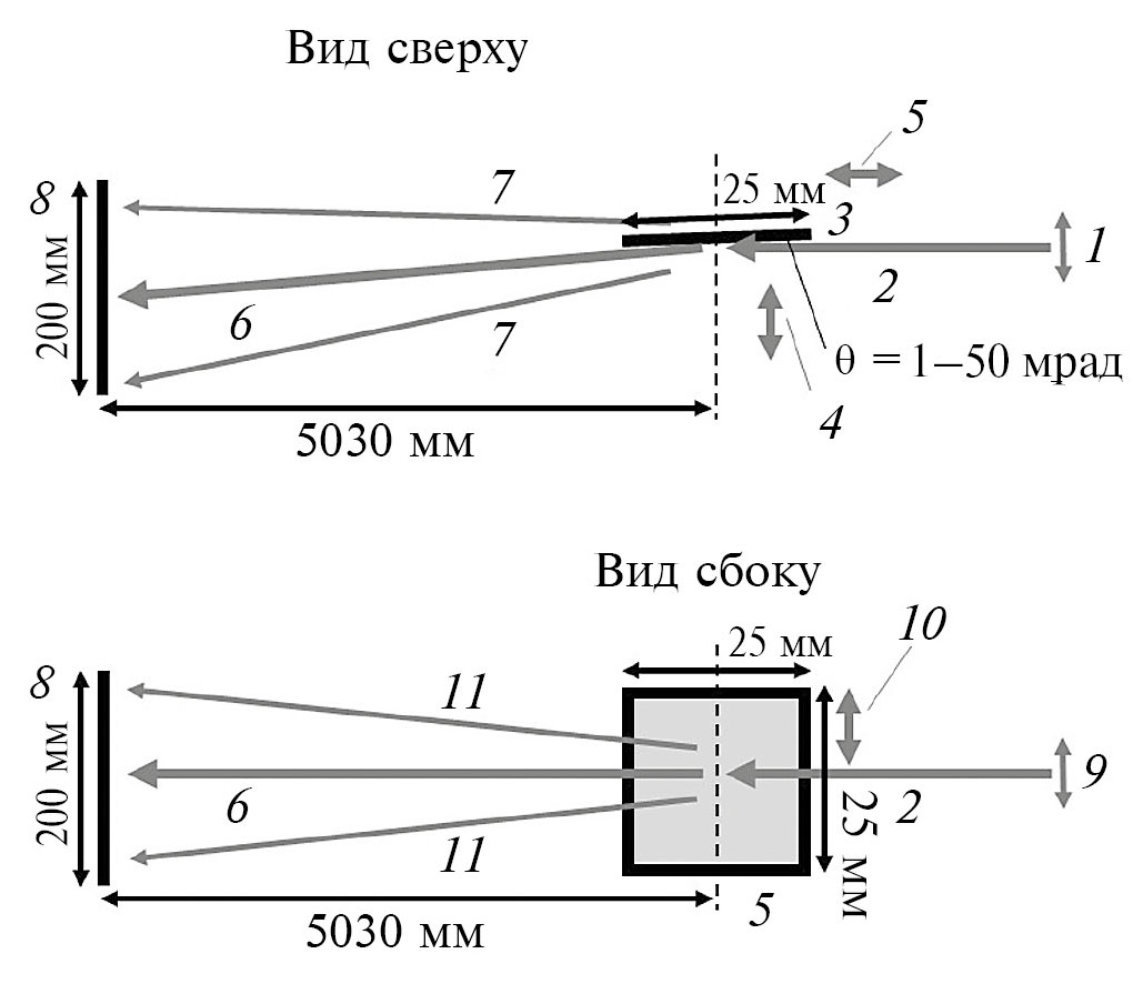 Рис. 1. Схема эксперимента на рефлектометре “РЕМУР”: 1 — горизонтальная апертура пучка шириной 0.1–1 мм, которую регулируют двумя диафрагмами; 2 — падающий пучок нейтронов; 3 — образец; 4 — магнитное поле, приложенное перпендикулярно плоскости образца; 5 — магнитное поле, приложенное в плоскости образца, направленное вдоль нейтронного пучка; 6 — отраженный пучок нейтронов; 7 — рассеянные нейтроны; 8 — позиционно-чувствительный детектор; 9 — вертикальная апертура пучка, около 20 мм, управляется двумя диафрагмами; 10 — магнитное поле, приложенное в плоскости образца, направленное перпендикулярно нейтронному пучку; 11 — рассеянные нейтроны.