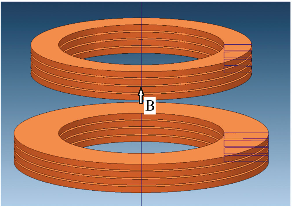 На рис. 2 представлена модель катушки, создающей поле с вертикальным направлением индукции, где показаны две группы обмоток, составляющие пару Гельмгольца. Каждая пара состоит из двух обмоток галетного типа.