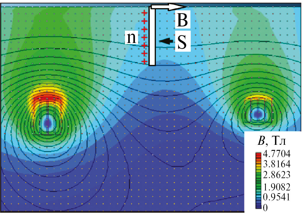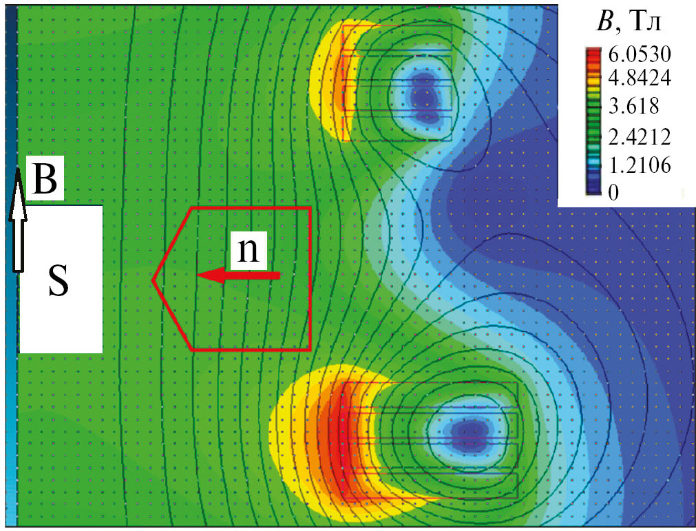 На рис. 3 представлена карта магнитного поля этой катушки. Для расчета параметров катушек было принято допущение, что катушка является кольцом с равномерной плотностью тока по сечению. Плотность тока вычисляли как произведение количества витков на силу тока, деленное на сечение кольца. Величина магнитной индукции в каждой точке получали интегрированием магнитной индукции от каждого элементарного кольца с током. Краевые условия задавали ограниченной областью распространения магнитной индукции с принятием ее величины на краях равной нулю. Ограниченная область представляла собой цилиндр радиусом 1000 мм и образующей 2000 мм, в котором по центру располагалась катушка. Полученные основные параметры для вертикальной пары катушек были следующими: ток — 120 А, диаметр первого слоя – 108 мм, верхняя группа обмоток — две двойные галеты по 297 слоев, нижняя группа обмоток — две двойные галеты по 527 слоев.
