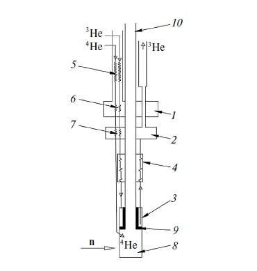 Рис. 6. Рефрижератор растворения 3Не в 4Не и совмещенный с ним рефрижератор 4Не: 1 –ванна с внутренней температурой среды 1 К; 2 — ванна испарения; 3 — камера растворения; 4 — теплообменники рефрижератора растворения; 5 — теплообменники системы циркуляции рефрижераторов; 6 — конденсаторы; 7 — капиллярные теплообменники; 8 — камера образца; 9 — теплообменник; 10 — шахта — трубка для загрузки образца в камеру образца; n — направление потока нейтронов.