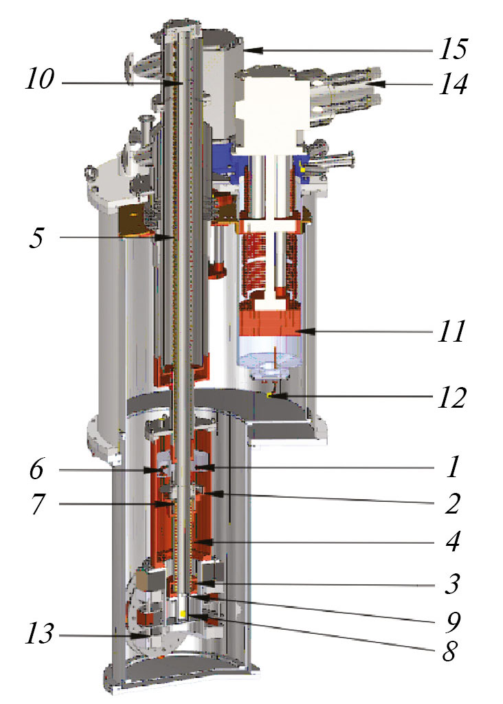 Рис. 7. Конструкторская модель криостата векторного магнита. Позиции 1–10 совпадают с рис. 6; 11 — ожижитель 4Не, 12 — трубка подачи жидкого 4Не, 13 — векторный магнит, 14 — криокулер ожижителя, 15 — криокулер, предназначенный для охлаждения векторного магнита.