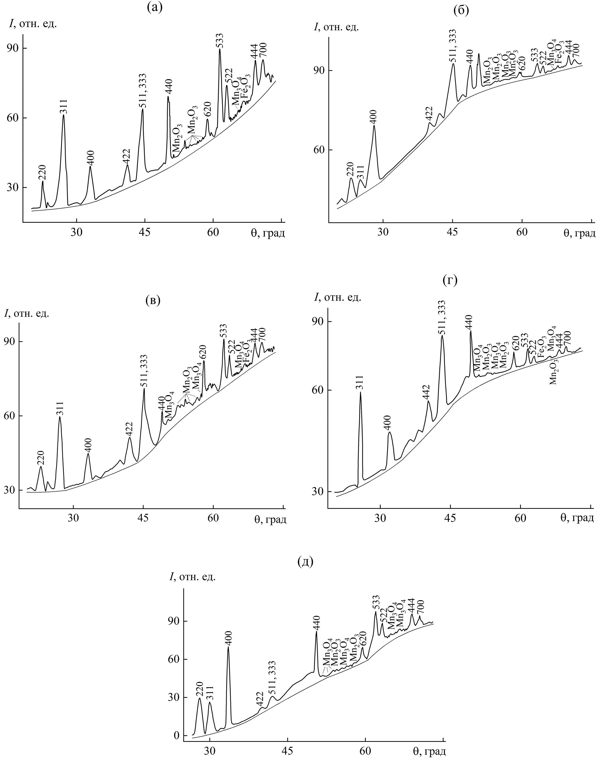 Фазы γ-Mn2O3 и γ-Mn3O4 характеризуются тетрагональной и ромбической решетками, а α-Fe2O3 — ромбоэдрической, что является реакцией матричной структуры, испытывающей искажения тетрагонального (a = b ≠ c, α = β = γ = 90°), ромбического (a ≠ b ≠ c, α = β = γ = 90°) и ромбоэдрического (a = b = c, α = β = γ ≠ 90°) типов. Измеряя ширину диффузных максимумов для исследуемых образцов, углы по методике [31] (длина волны λ CrKα-излучения), оценили линейный размер кластеров по формуле: