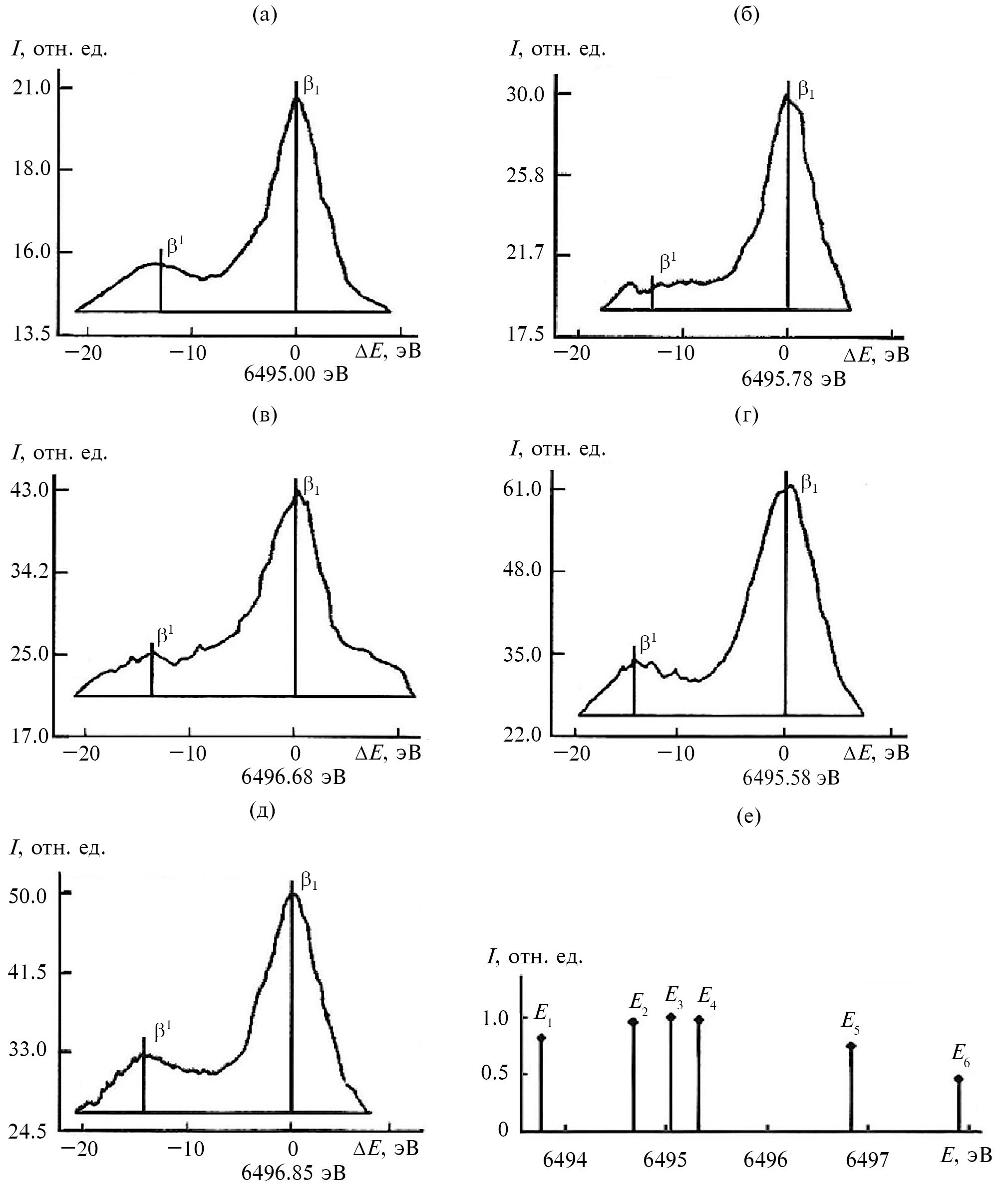 На рис. 2 представлена тонкая структура эмиссионных рентгеновских спектральных линий MnKβ для ферритов, различающихся концентрационным соотношением электронной плотности при разложении β1-линии для теоретически полученных значений энергии Е1, …, Е6. Анализ тонкой структуры мультиплета MnKβ1 позволил проследить особенности перераспределения электронов валентной полосы марганца в Mn–Zn феррите в зависимости от его содержания и сравнить со спектром железа.