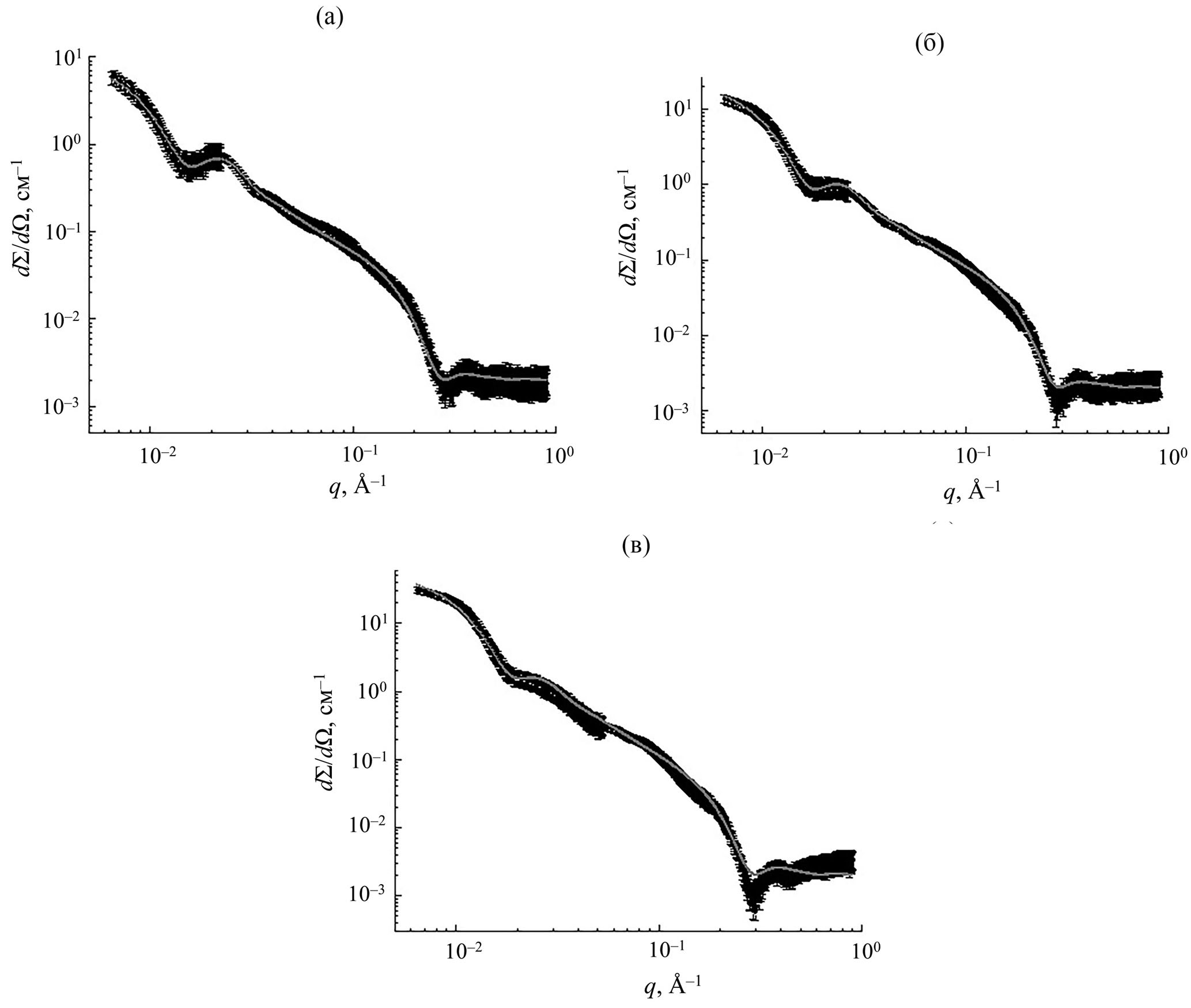 Рис. 3. Экспериментальные кривые малоуглового рассеяния (установка ДИКСИ) везикул ФТНС при концентрации 25% (а), 31.25% (б) и 37.5% (в). Точки — эксперимент, сплошная линия — расчетная кривая.