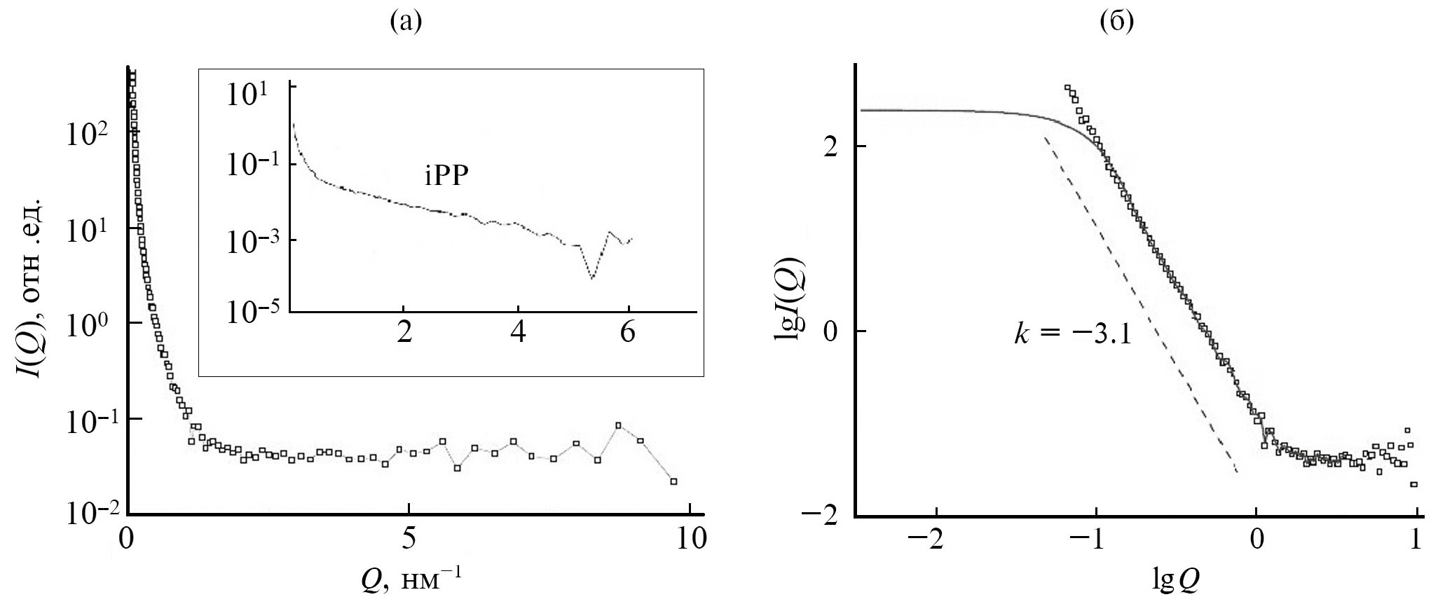 Спектры МУРН на композите ИПП, допированном наночастицами фуллерена С60 (16.5 мас. %), измерены на спектрометре “ЮМО”, установленном на реакторе “ИБР-2” ЛНФ им. И.М. Франка ОИЯИ, г. Дубна, РФ [2]. В эксперименте регистрировали количество событий в зависимости от времени пролета нейтронов через 16 колец двух детекторов. С помощью программы SAS [29] осуществляли пересчет и нормализацию на калибровочный стандарт по известному сечению рассеяния от времени пролета к дифференциальному сечению рассеяния dΣ/dΩ(Q), а также нормализацию на толщину образца. За рассеяние от контрольного образца, которое выделено из экспериментальной кривой МУРН на образцах I(Q), принимали рассеяние от матрицы полимера ИПП. После учета рассеяния на контрольном образце экспериментальные кривые МУРН характеризуются рассеянием только на неоднородных областях (“рассеивающих частицах”) в системе, имеющей длину рассеяния, отличную от длины рассеяния полимерной матрицы.