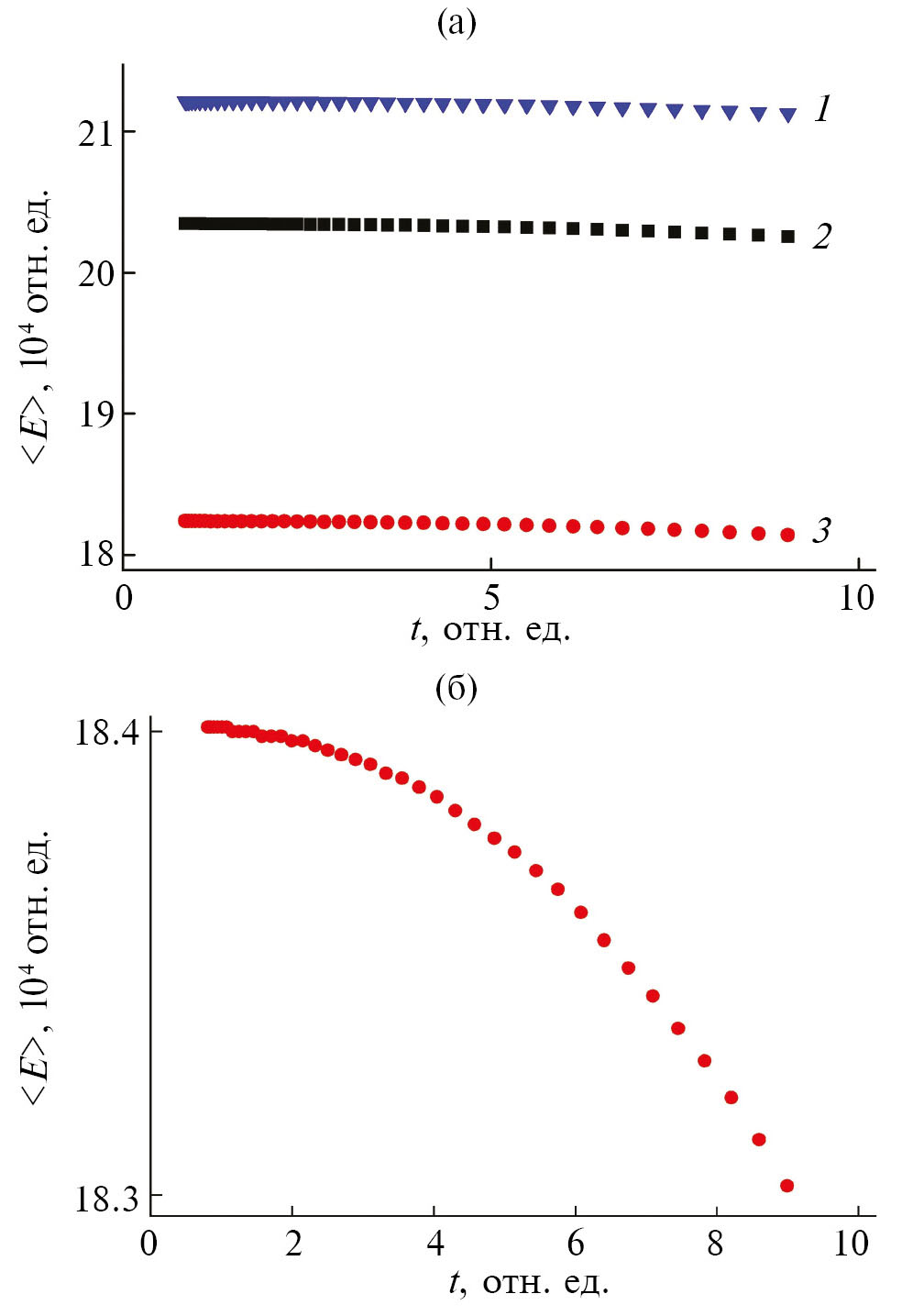 Рис. 3. Температурная зависимость средней энергии монопольных токов при концентрации наполнителя: а — 1 (1), 5 (2), 16.5 мас. % (3); б — 16.5 мас. %. Погрешность вычислений методом Монте-Карло составила 0.1% (не показана).