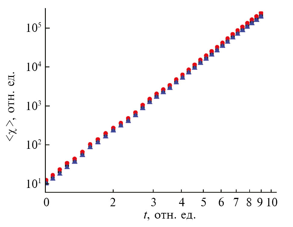Рис. 4. Магнитная восприимчивость <χ> в зависимости от температуры для различных концентраций наполнителя 1, 5 и 16.5 мас. % (треугольники, квадраты и кружки соответственно), погрешность вычислений методом Монте-Карло составила 0.1% (не показана).