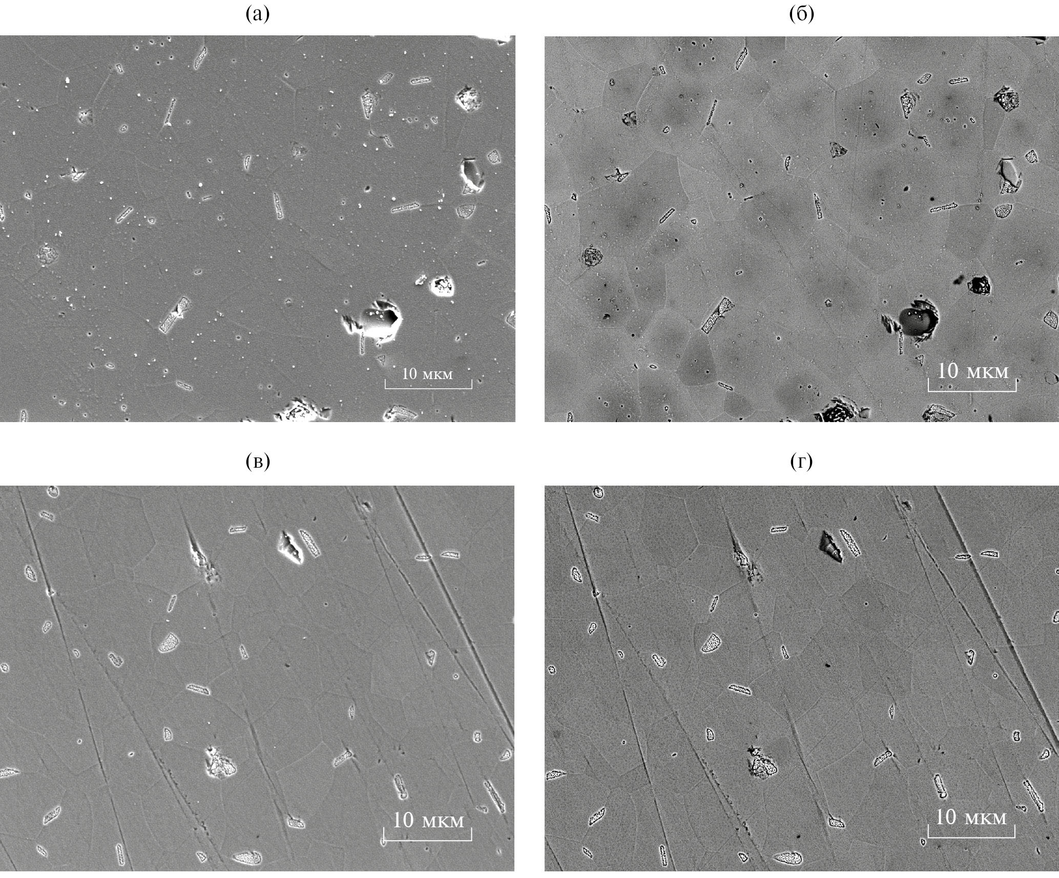 Рис. 1. РЭМ-изображения образцов 2-850 (а, б), 2-1200 (в, г) шлифов керамики GYAGG:Ce с остаточным фосфором из введенной диспергирующей добавки, полученные в режиме детектирования обратно рассеянных (а, в) и вторичных электронов (б, г).