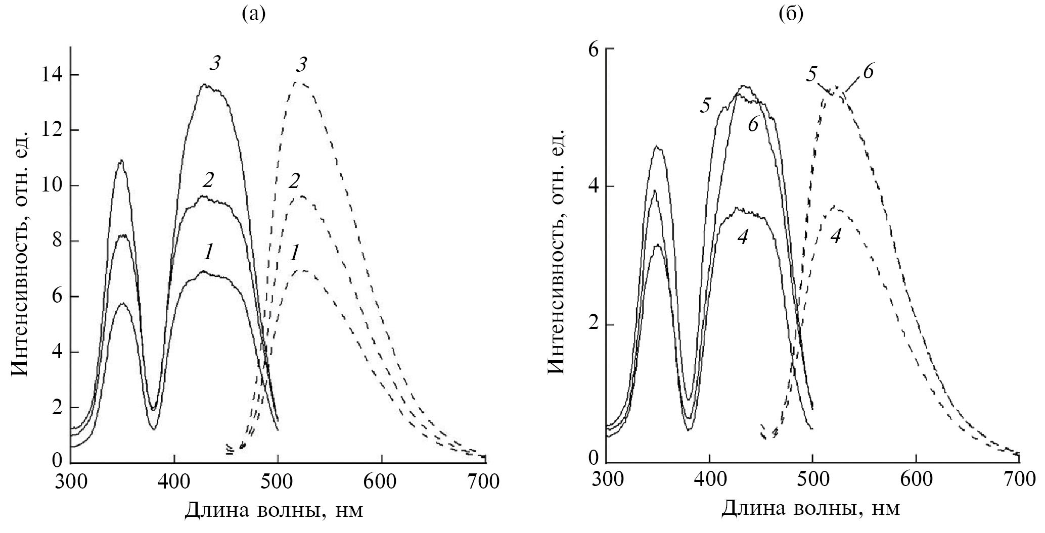 Рис. 2. Спектры фотолюминесценции (λвозб = 350 нм) (штриховые линии) и спектры возбуждения фотолюминесценции (λрег = 520 нм) (сплошные линии) керамики GYAGG:Ce: а — образцы 0-850 (1), 1-850 (2), 2-850 (3); б — образцы 0-1200 (4), 1-1200 (5), 2-1200 (6).