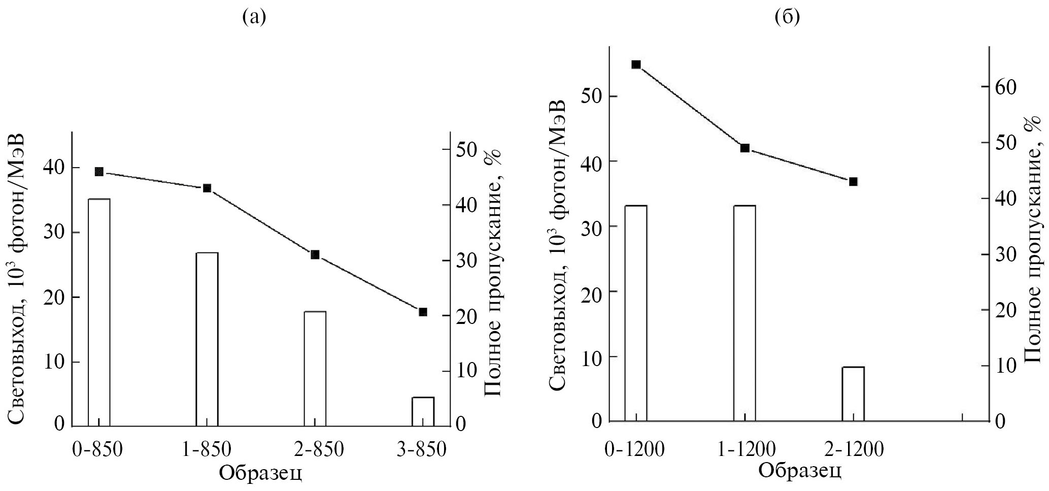 Технический световыход при регистрации γ-излучения с использованием керамических образцов GYAGG:Ce коррелирует с их прозрачностью (рис. 3). Наблюдается явное ухудшение световыхода с уменьшением коэффициента пропускания (с увеличением содержания фосфора). Похожее поведение было замечено ранее в [22]. Оптическая прозрачность образцов керамики из порошка, предварительно обработанного при 1200°C, в целом выше (рис. 3б).