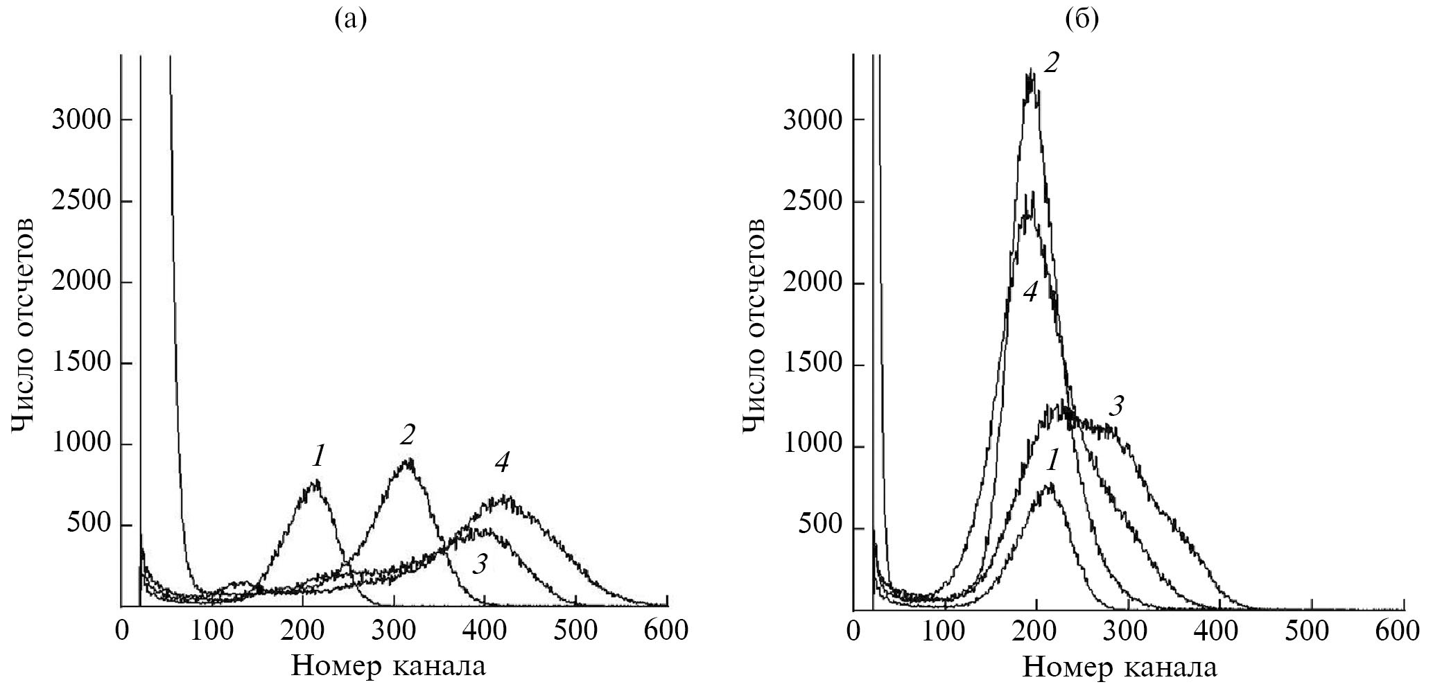Рис. 4. Амплитудные спектры эталонных образцов YAG:Ce (1) и керамики GYAGG:Ce, измеренные под действием α-частиц: а — образцы 0-850 (2), 1-850 (3), 2-850 (4); б — образцы 0-1200 (2), 1-1200 (3), 2-1200 (4).