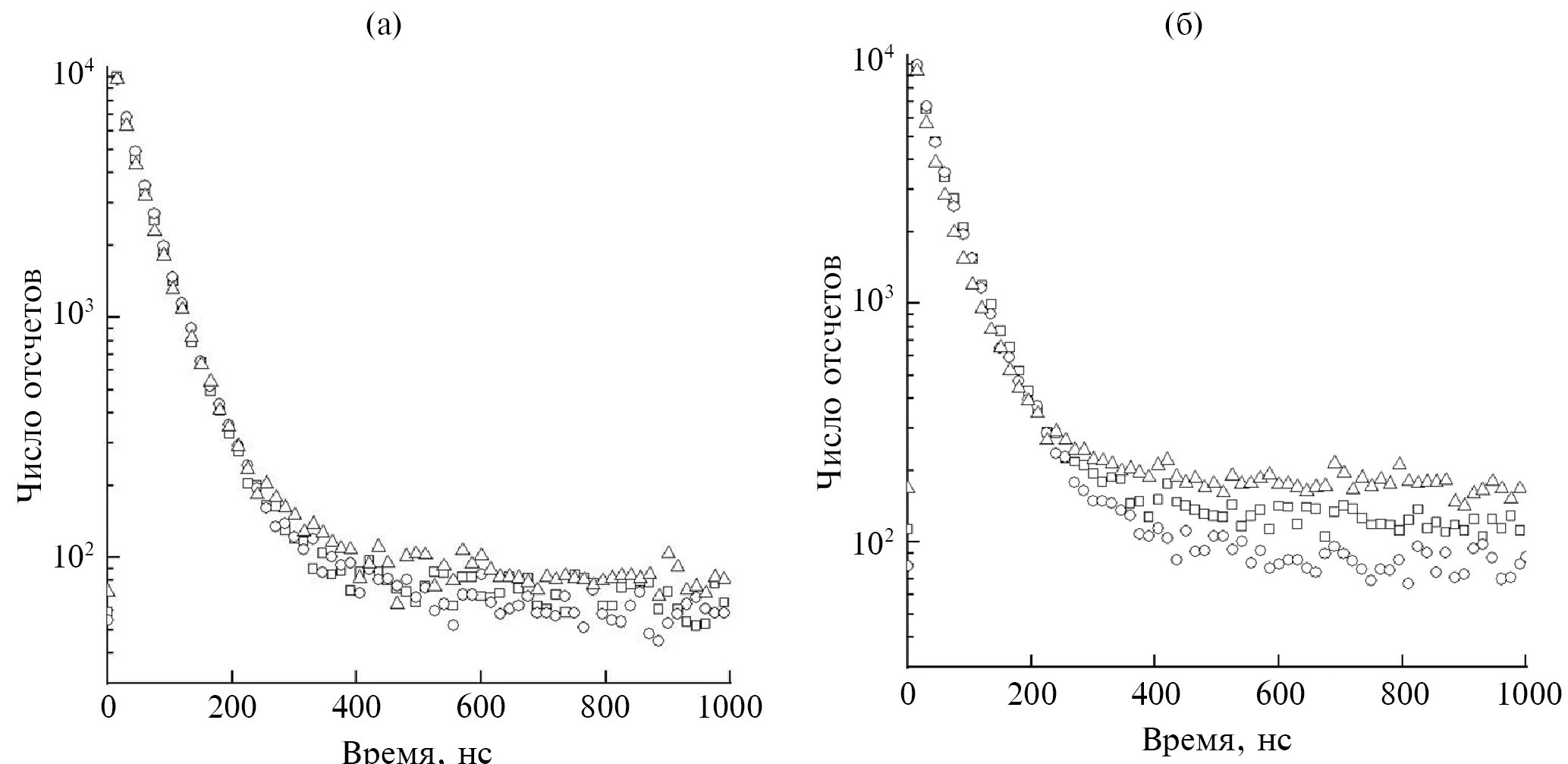 Рис. 5. Кинетика фотолюминесценции керамики GYAGG:Ce при λрег = 520 нм и возбуждении λвозб = 340 нм: а — образцы 0-850 (квадрат), 1-850 (круг), 2-850 (треугольник); б — образцы 0-1200 (квадрат), 1-1200 (круг), 2-1200 (треугольник).