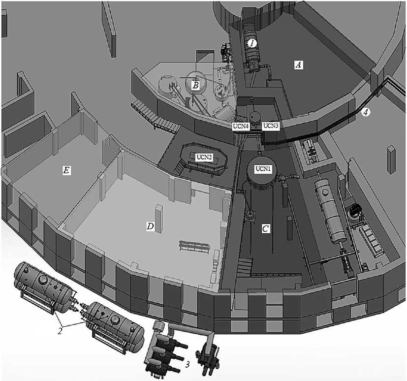 Рис. 5. Общий вид оборудования технологического комплекса источника УХН на реакторном комплексе ПИК. A — защитный каземат канала ГЭК-4, B — зона криогенного оборудования источника УХН, C — зона экспериментальных установок на пучках УХН, D — мастерская для экспериментов на пучках УХН, E — комната оператора источника УХН. 1 — внутриказематная часть источника УХН, 2 — сосуды с изотопно-чистым 4Не, 3 — система вакуумной откачки паров гелия, 4 — гелиевые и дейтериевые трубопроводы.