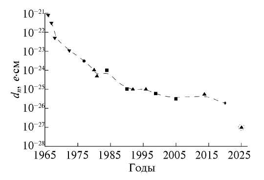 Рис. 7. Прогресс в понижения верхнего предела величины электрического дипольного момента нейтрона dn. ▼ — ORNL-Harvard, ● — ORNL-ILL, ■ — ILL-sussex-RAL, ♦ — PSI, ▲ — ПИЯФ. Результаты до 1980 года получены с использованием холодных нейтронов. Последняя точка — прогноз результата, который будет получен к 2025 году на новом источнике УХН на реакторе ПИК.