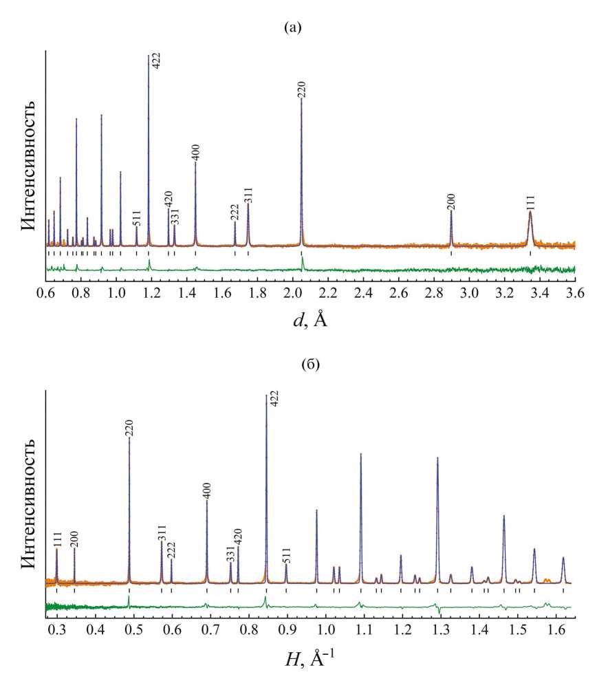 Рис. 1. Нейтронная дифрактограмма сплава Fe74Al26 в шкале d — межплоскостного расстояния (a) и в шкале H = 1/d — длины вектора в обратной решетке (б). Показаны экспериментальные точки, рассчитанный профиль, разностная кривая и индексы Миллера некоторых пиков. Вертикальные штрихи — положения дифракционных пиков для структурной фазы D03 (кубическая, Fmm, a = 5.795 Å).