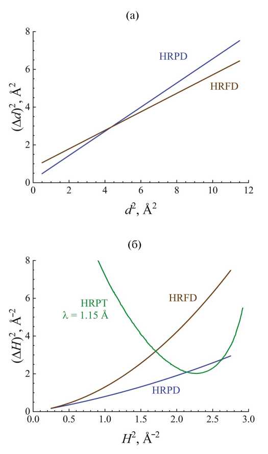 где ∆d или ∆H — ширина пика в d- или H-шкале, C1 и C2 — константы, связанные с ∆t0 и ∆θ соответственно. Для стандартного TOF-дифрактометра, например HRPD на источнике с коротким импульсом ISIS [14], ширина нейтронного импульса не является постоянной, а изменяется в первом приближении как ∆t0 ~ t, и, соответственно, функция разрешения практически не зависит от t, R ≈ const в широком диапазоне времен пролета. Сравнение поведения ширин дифракционных пиков для TOF-дифрактометров HRFD и HRPD (High Resolution Powder Diffractometer, ISIS) для двух типов переменной сканирования приведено на рис. 2. Для случая H-шкалы показана также ширина дифракционных пиков, измеряемых на λ0-дифрактометре HRPT (High-Resolution Powder Diffractometer for Thermal Neutrons, PSI) [15]. Очевидными особенностями показанных функций являются линейность зависимости (∆d)2 от d2 для TOF-дифрактометров в d-шкале и наличие глубокого минимума на зависимости (∆H)2 от H2 для λ0-дифрактометрa.