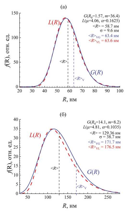Рис. 5. Сравнение логнормального (L(R), пунктирная линия) и гамма- (G(R), , сплошная линия) распределений, вычисленных по характеристикам пика 111 от сплава Fe74Al26, после отливки (а) и медленного нагрева и охлаждения (б) и имеющих одинаковые первый и второй моменты.