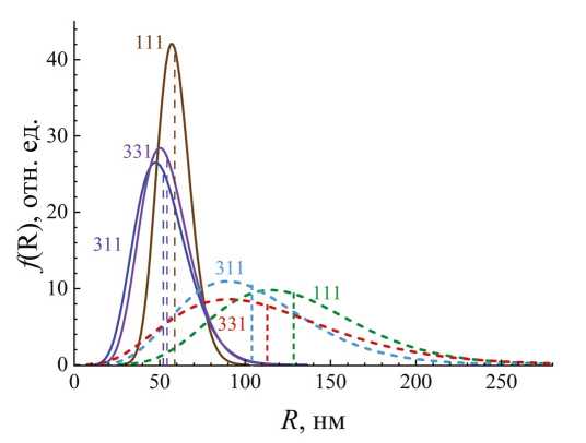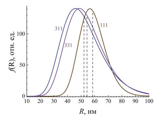 В табл. 2 приведены средние размеры и дисперсия распределения по размерам упорядоченных кластеров фазы D03 в составе Fe74Al26, рассчитанные по характеристикам нескольких сверхструктурных пиков, и параметры гамма- и логнормального распределений. Рассчитанные по ним логнормальные распределения показаны на рис. 6.