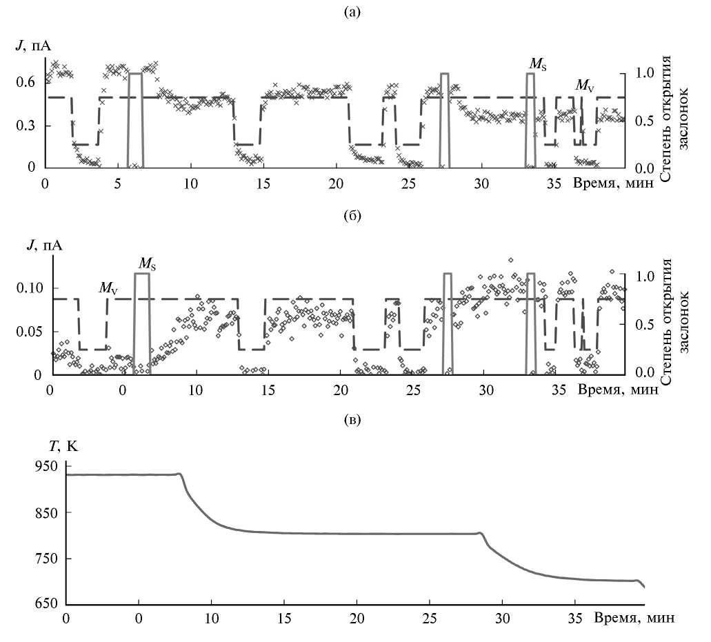 Скорости реакций ассоциации мономеров и диссоциации димеров зависят от температуры образца T. При изменении температуры соотношение димеров и мономеров в уходящих с поверхности потоках изменяется. Диапазон изменения выбран в высокотемпературной области, где не происходит конденсации пленки. На рис. 1 показан типичный пример экспериментальных данных. На рис. 1а и 1б — ионные токи J(Те+) и J(Те2+), записанные при изменении температуры образца от 930 до 700 К. Здесь и далее ионный ток выражен в пА. Там же указаны интервалы для измерения фона, когда закрыта заслонка падающего пучка (МV) или масс-спектрометра (МS). На рис. 1в показано изменение температуры образца T. При уменьшении температуры образца ионный ток мономеров уменьшается почти в два раза (рис. 1а), а ионный ток димеров увеличивается более чем в три раза (рис. 1б). В начале замера, при высокой температуре образца (T = 930 К), отношение ионных токов J(Те+)/J(Те2+) = 0.67/0.016 = 42, а в конце, при T = 700 К, J(Те+)/J(Те2+) = 0.37/0.1 = 3.7. В данном примере соотношение токов изменятся более чем в 10 раз! Очевидно, что в этих условиях ионный ток мономеров не является мерой общего потока десорбции теллура, который остается постоянным.