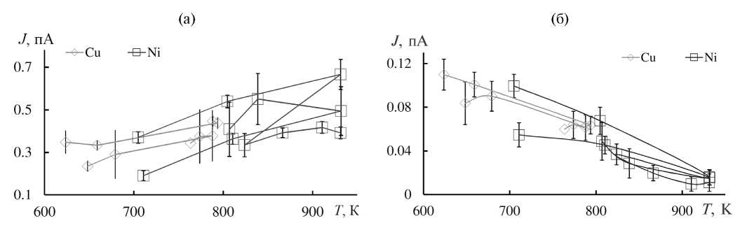 Рис. 2. Данные первичной обработки для подложек Ni и Cu: средние значения ионных токов J(Te+) (а) и J(Te2+) (б) в зависимости от температуры образца Т.