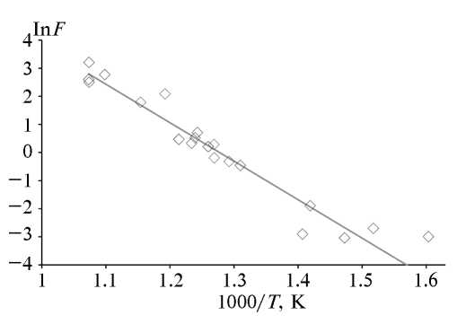 На рис. 3 в логарифмическом масштабе показана аппроксимирующая функция Fapr = lnc + b/T, где параметр d = 2.5 выбран с помощью соответствующего расчета по экспериментальным точкам. Полученное значение энергии диссоциации E согласуется с данными работ по исследованию Те в условиях, приближенных к равновесным [20, 21].
