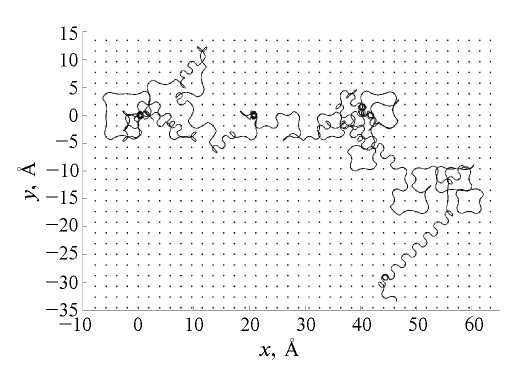 Пример типичной траектории электрона в поперечной плоскости представлен на рис. 2. На нем видно, каким именно образом возникает аномальная диффузия: частица время от времени захватывается в плоскостной канал и быстро удаляется от области предшествующей локализации, что и представляет собой полеты Леви, приводящие к супердиффузии в поперечной плоскости.